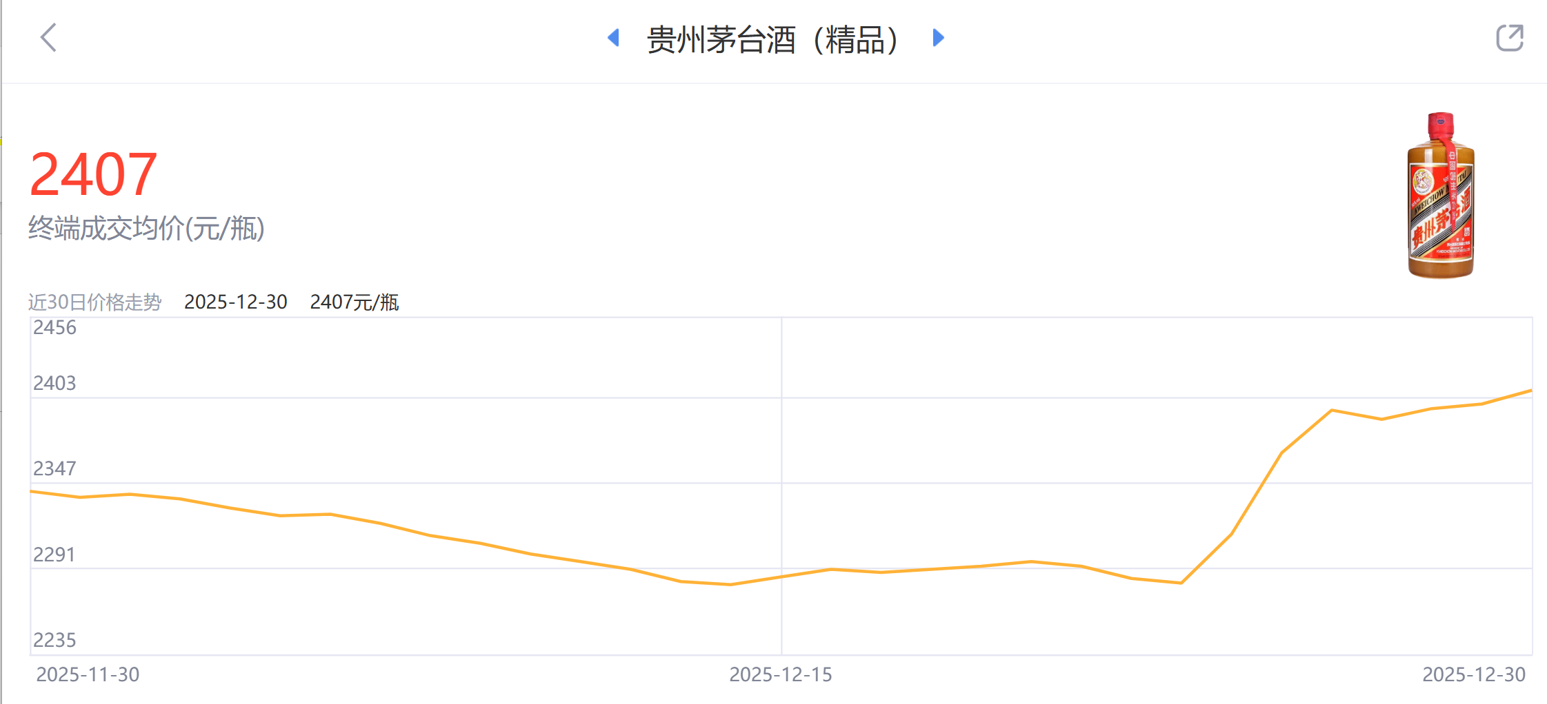 精品茅台价格三连涨 突破2400元/瓶