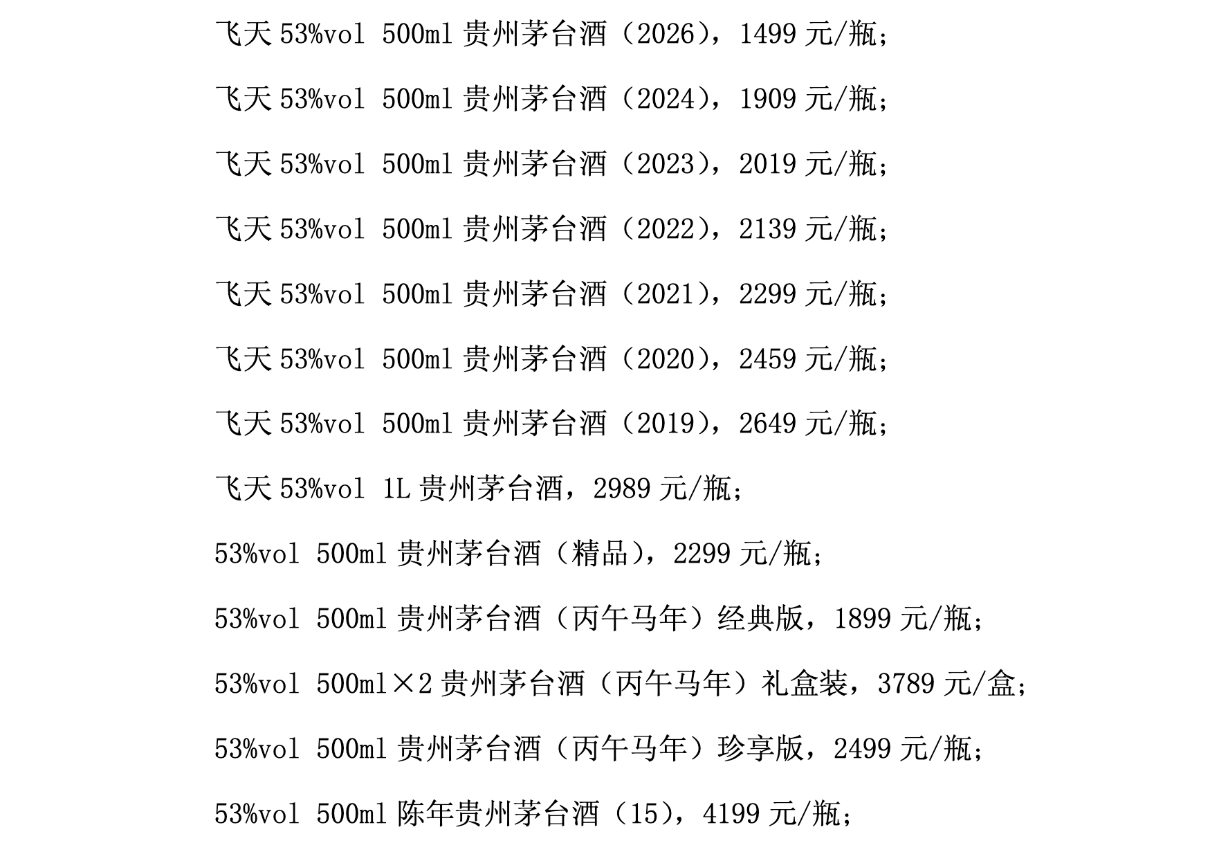 茅台调整了多款产品零售价。核心大单品飞天茅台(普茅)当前零售价1499元,并且以普茅为锚点,调价的历年2019-2024年飞天茅台随年份增长价格有所提升,最贵的2019年飞天茅台定价2649元。事实上,i茅台对次新茅台定价要高于市场价,据媒体报道,2019年原箱茅台市场上售价13200元/6瓶,约合2200元/瓶,还要低于茅台指导零售价。国泰海通证券研报分析,贵州茅台对普飞定价旧一年较新一年溢价5%-8%,有望对线下批发价形成指引。