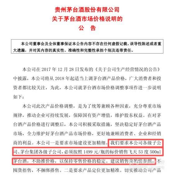 以大单品53度500ml飞天茅台为例,茅台官方的定价是1499元,已经维持了八年。在2017年12月提价后,贵州茅台在2018年1月的公告中,明确要求下属公司和茅台集团下属公司必须按照1499元的标价销售,并建议经销商酌情参照。