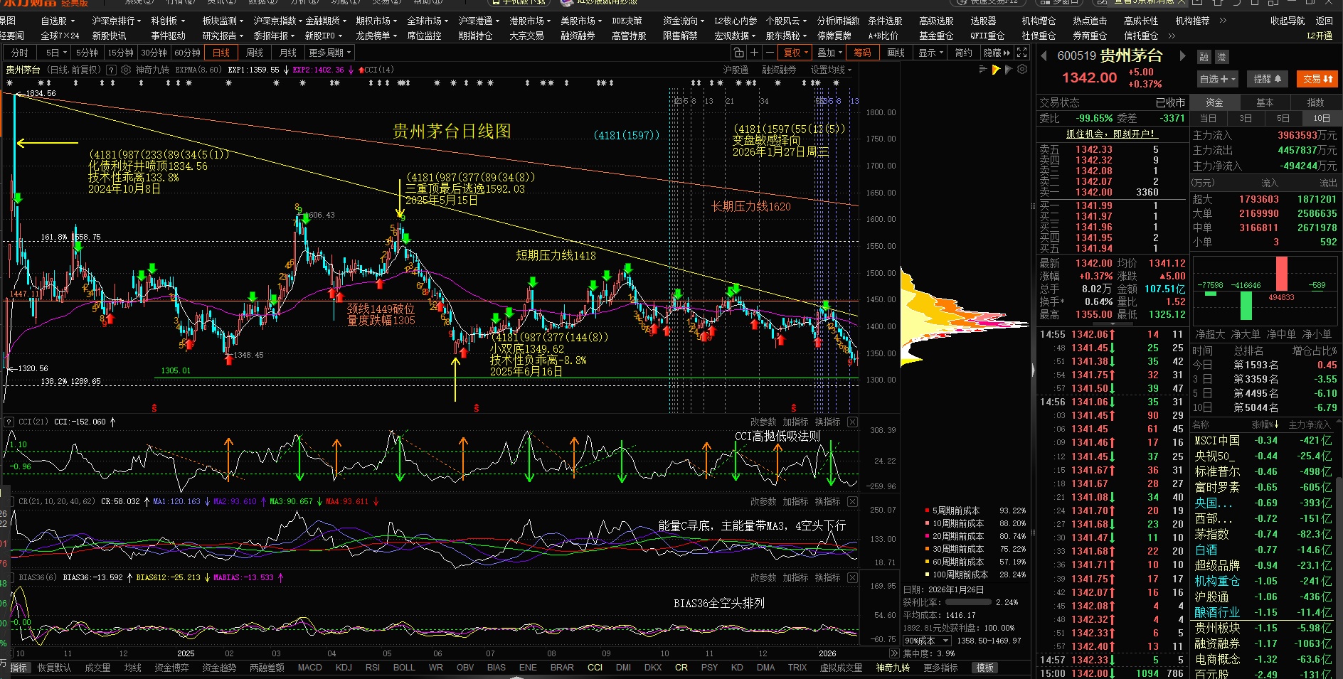 看月线图主力出货后,贵州茅台陷入散户买卖白柱多时!能量不断下滑,月均线空头排列,并跌破MA89月线1371.9(中期清仓线),