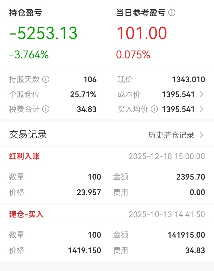 本号持有茅台106天,合计亏损一年股息!!!毛毛雨,希望破1300元,可以再来一