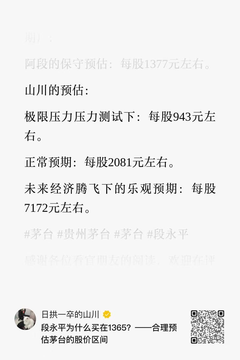 $贵州茅台(SH600519)$ 段永平为什么买在1365,茅台股价区间预估