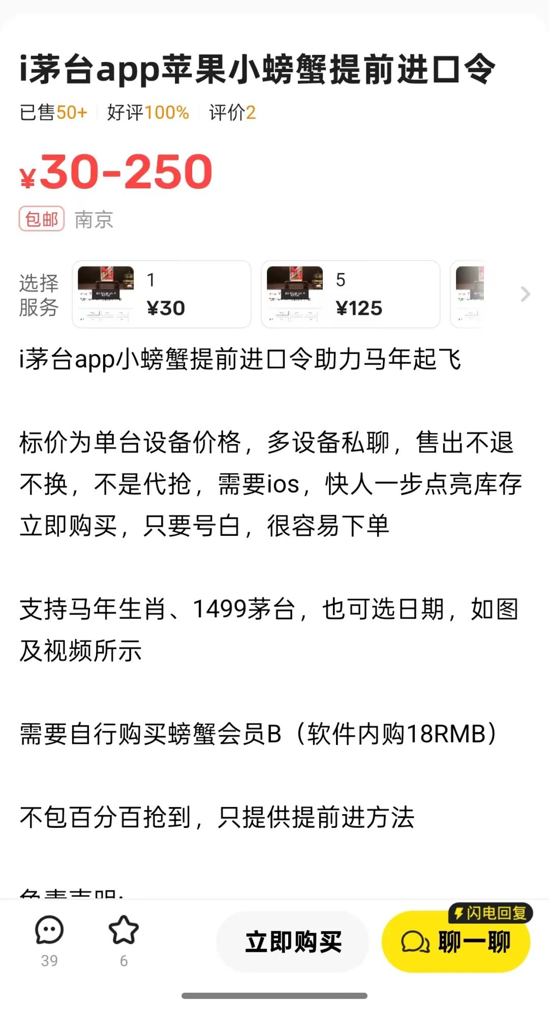 记者点开一位售价30元、显示“已售50+”的商家的界面,发现其对“小螃蟹”的描述为“快人一步点亮库存立即购买,只要号白,很容易下单,支持马年生肖、1499茅台,也可选日期……”