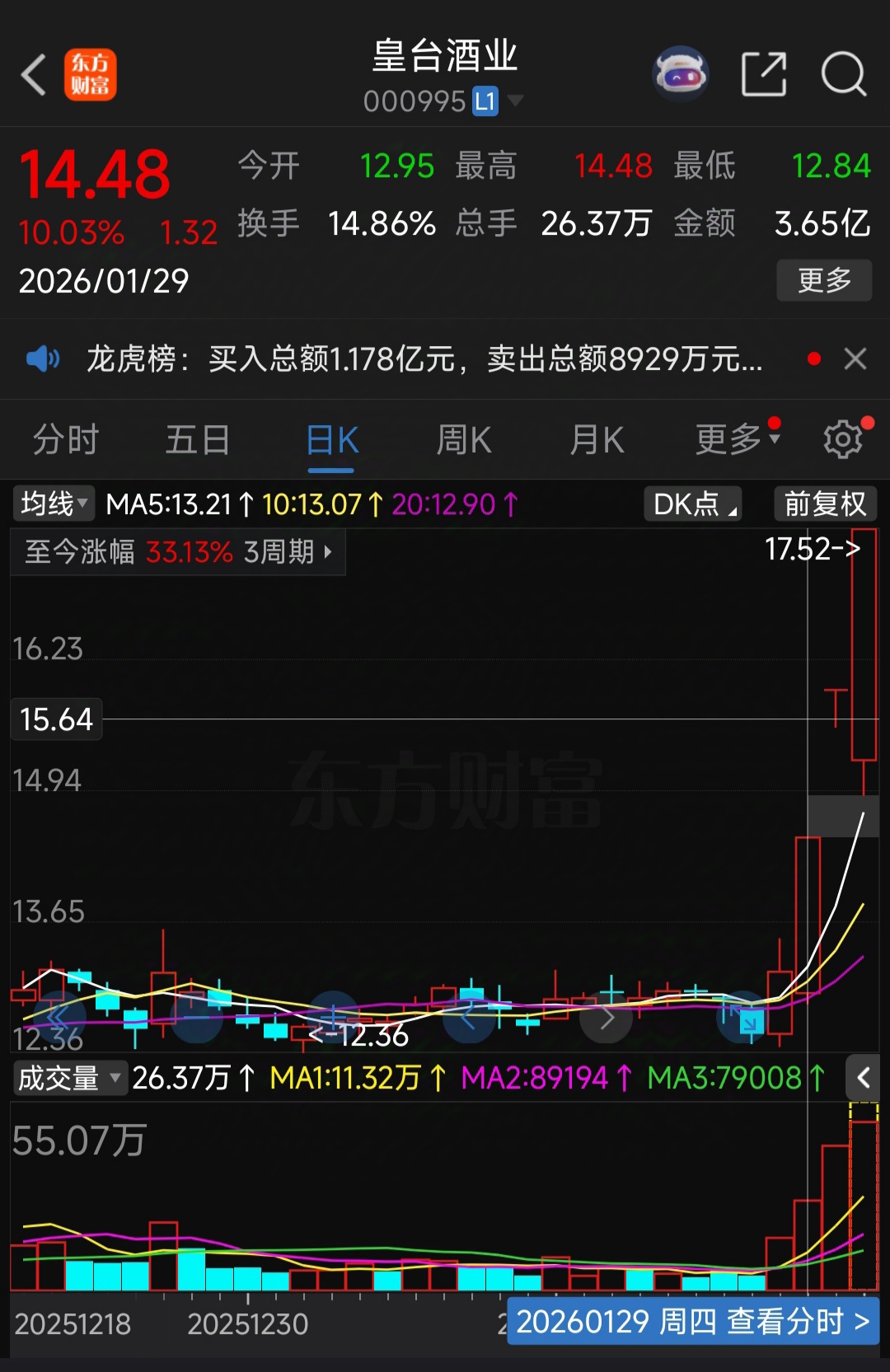 皇台酒业是我1月29日重点强调的一只股,今天迎来三连涨停,不错