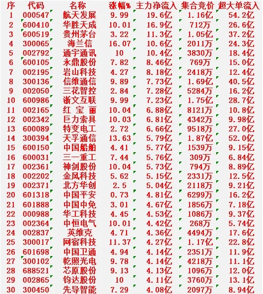 尾盘时段主力资金展开大幅抢筹,核心标的获大额资金净流入,集合竞价同样呈现活跃成交态势,具体核心名单如下: