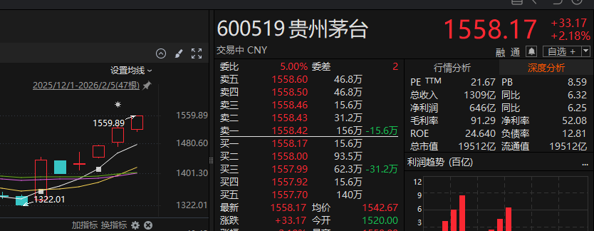 贵州茅台今日小幅低开后,盘中逆势拉升,截至发稿,上涨2.26%,最新股价报1559.46元/股,成交额超60亿元,总市值重新站上2万亿元。