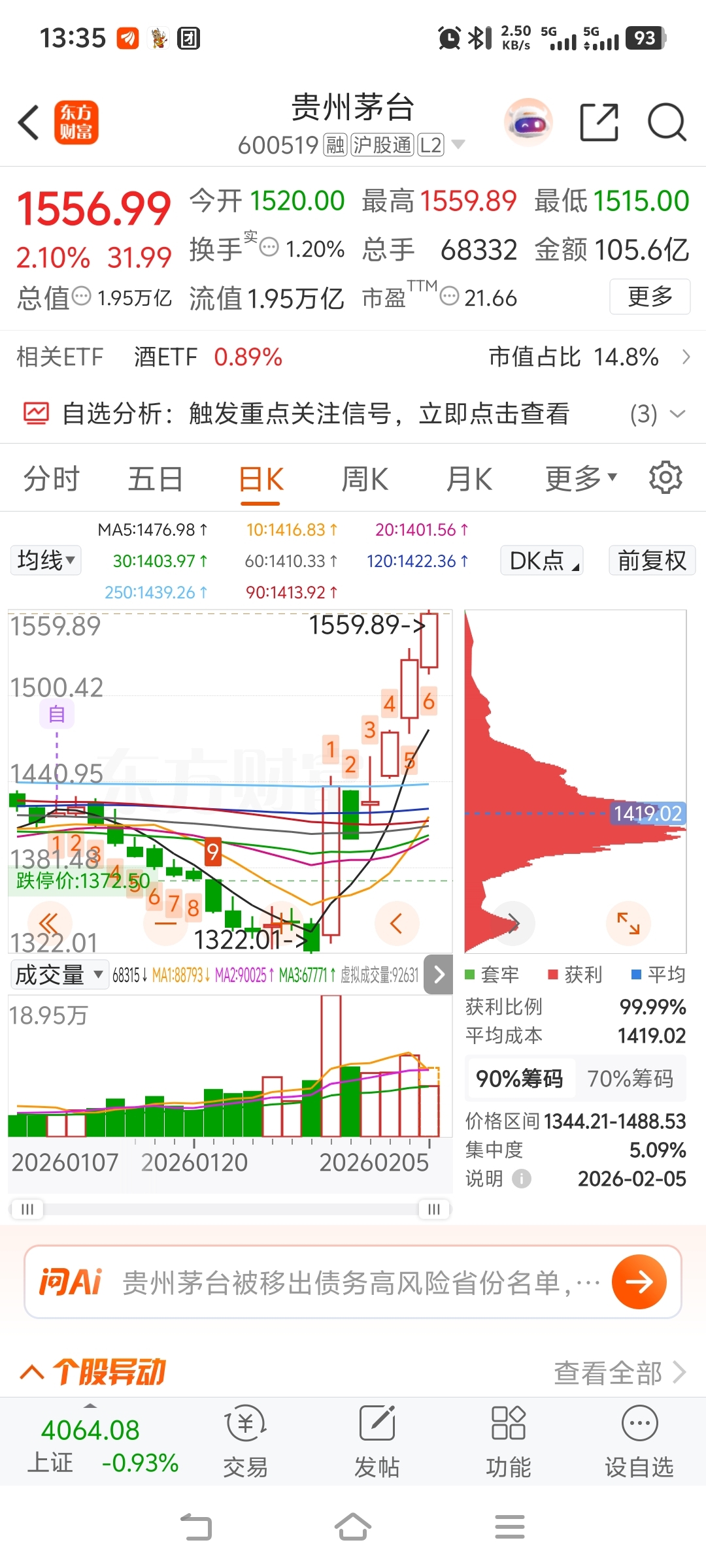 $贵州茅台(SH600519)$ 日线上都没套牢盘了。