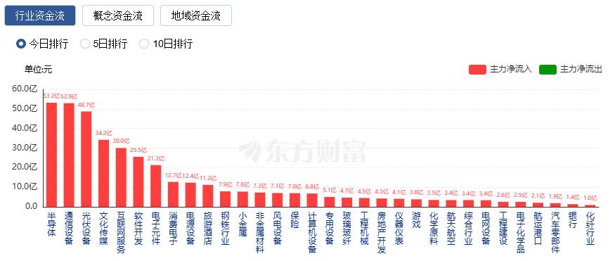 行业资金方面,截至收盘,半导体、通信设备、光伏设备等净流入排名靠前,其中半导体净流入53.19亿。