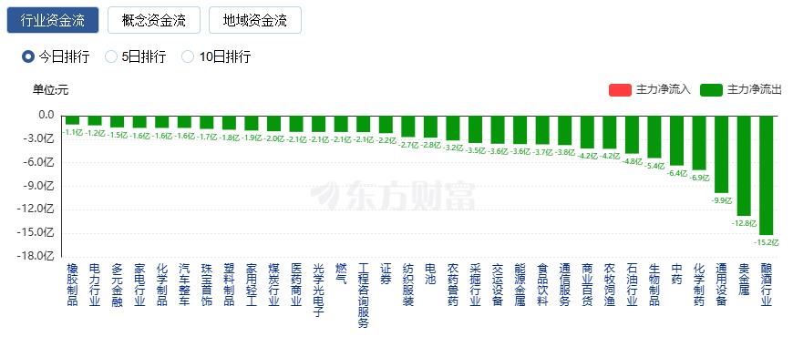 净流出方面,酿酒行业、贵金属、通用设备等净流出排名靠前,其中酿酒行业净流出15.23亿元。