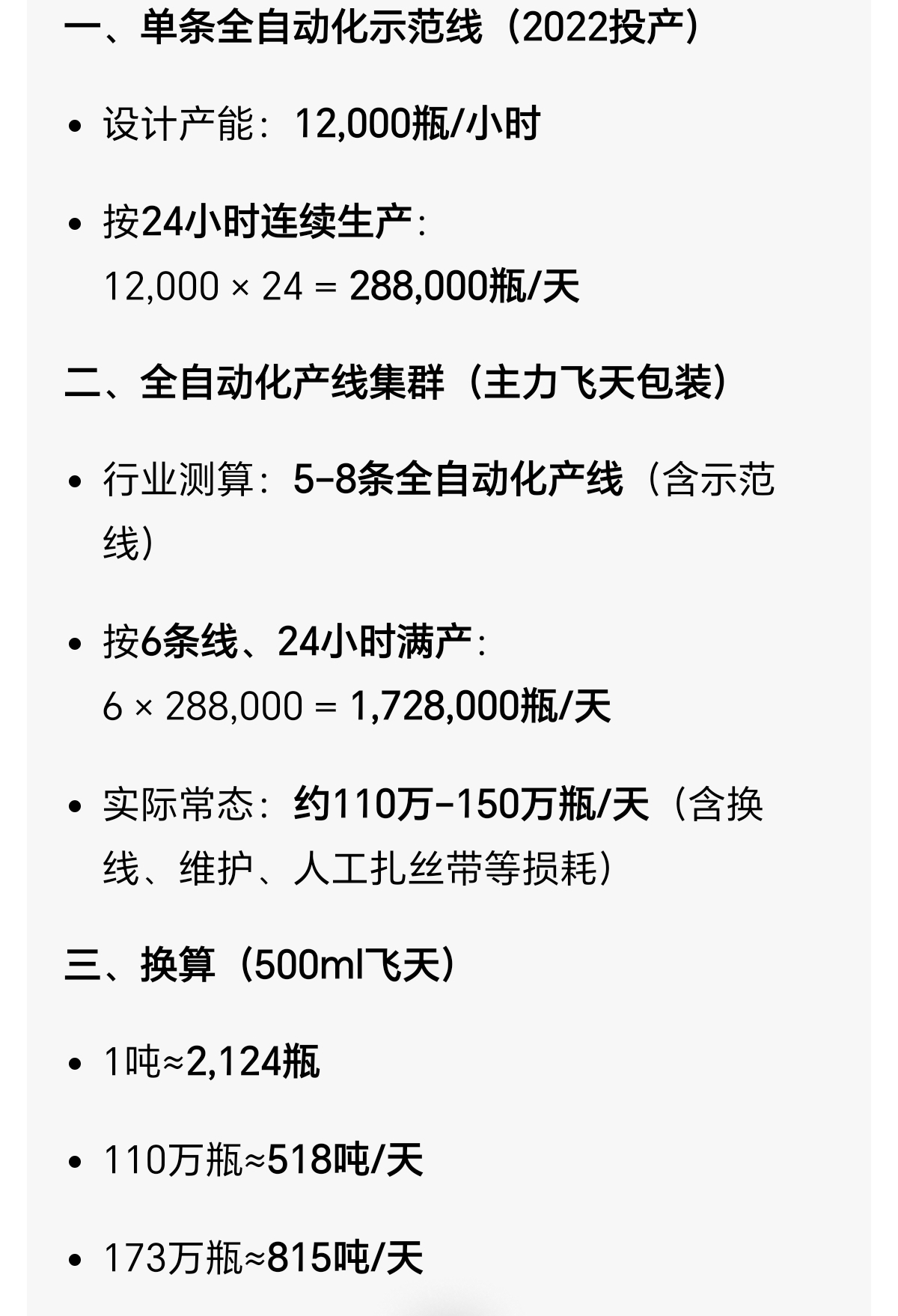 经测算,茅台产能极限是每天172万瓶,网上那些茅台春节加班产能恐慌的言论可以休矣