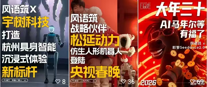 2026春晚,风语筑(603466.SH)成为最大赢家。人形机器人方面不仅有与宇树科技的合作,还有松延动力的战略伙伴关系,更有字节跳动即梦Seedance2.0×风语筑“Al马上出发”。大年三十过后,Al马年尔等有福、尔等有钱了!