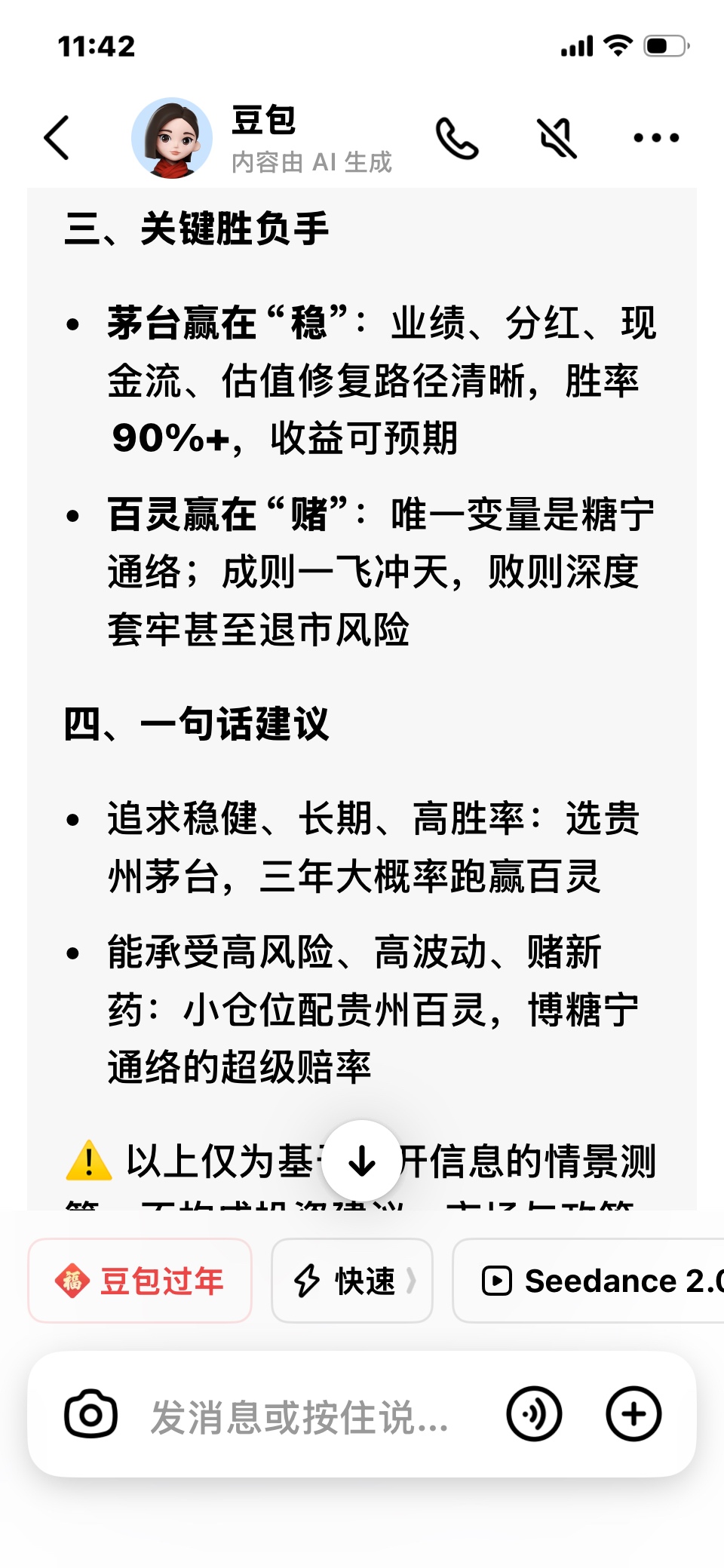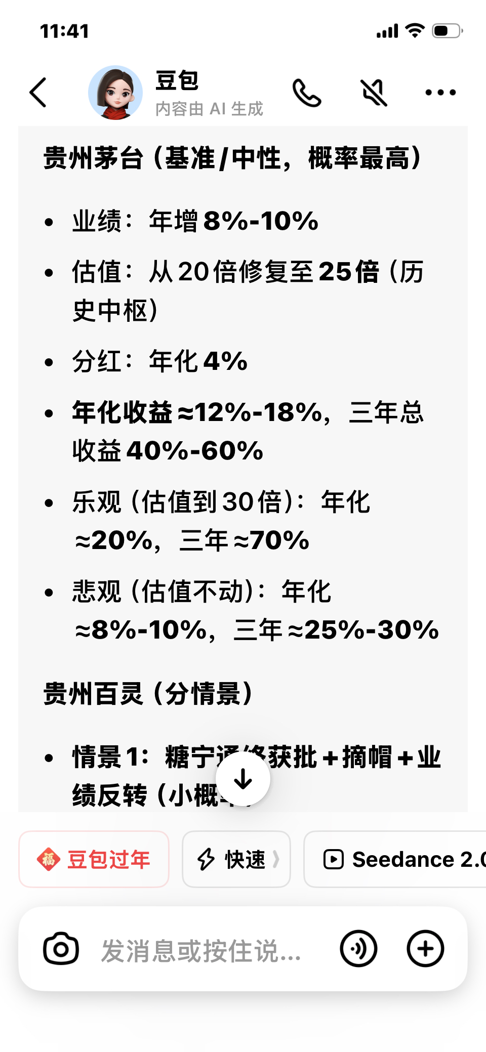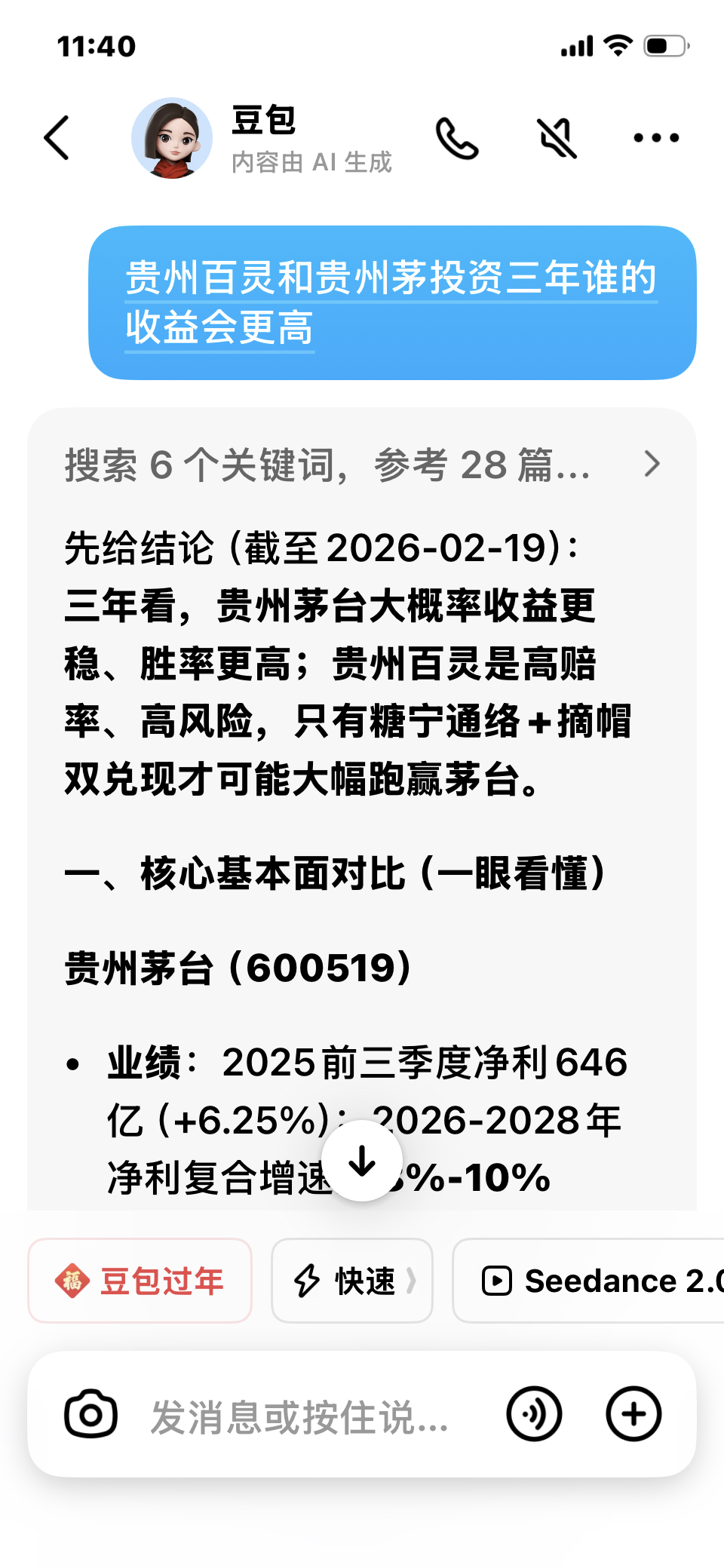 贵州茅台和贵州百灵同时持有三年,看豆包分析谁的收益率更高