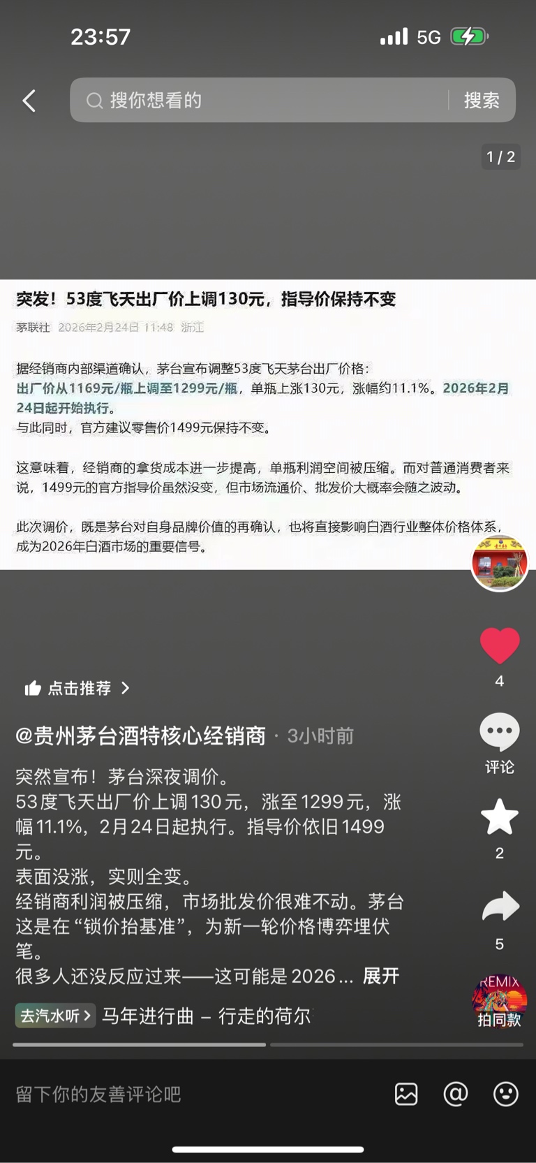 $贵州茅台(SH600519)$ 重大利好,53飞天上调出厂价,1169上调到1299,每瓶上调130元,上调幅度为11%