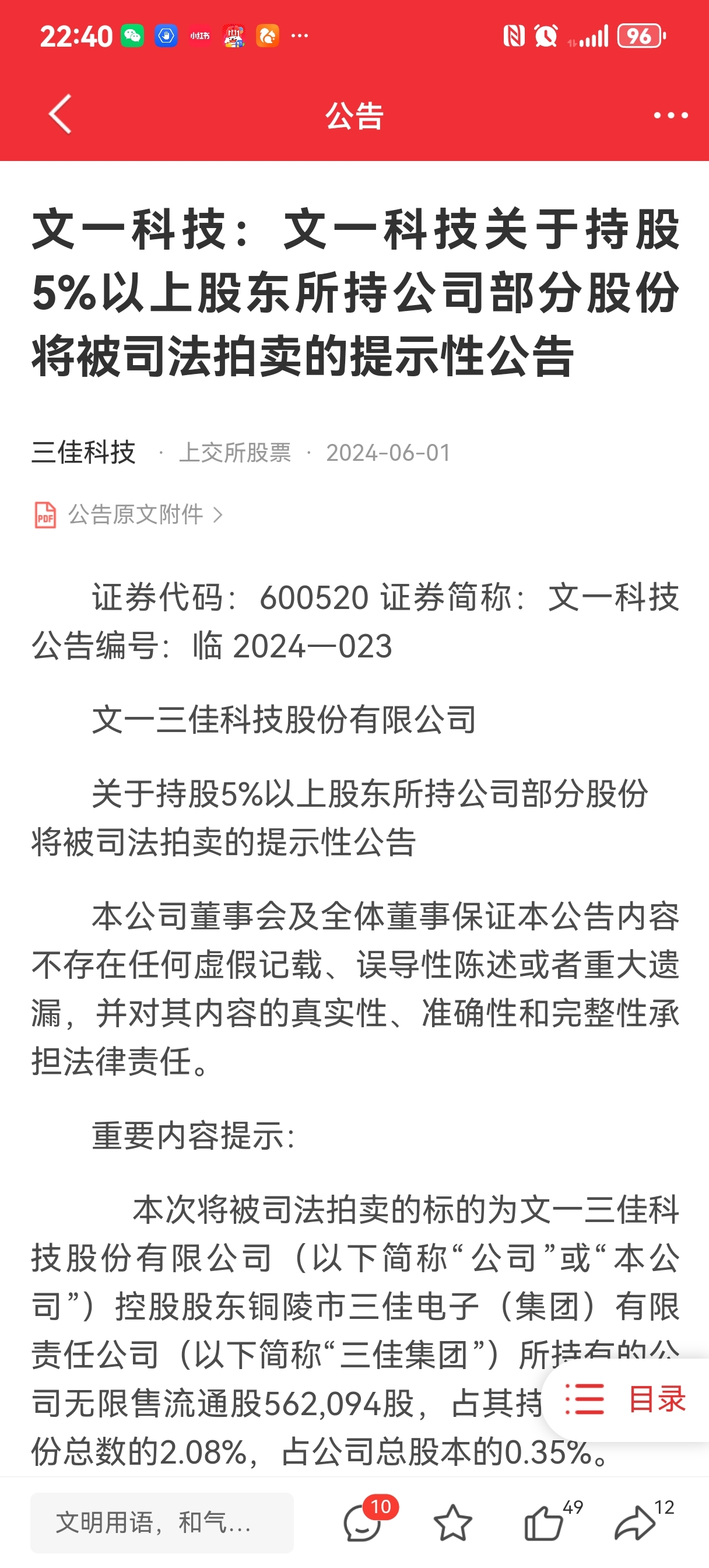 2024年6月1日公司股东铜陵三佳的股份就由于案件纠纷被拍卖过,当时应该是流拍了