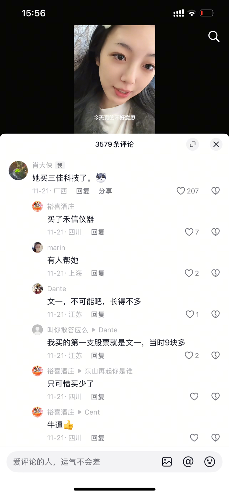 上个星期五手多,跑去王小雨评论区留言,她说买了三佳科技,结果被200多人点赞,评