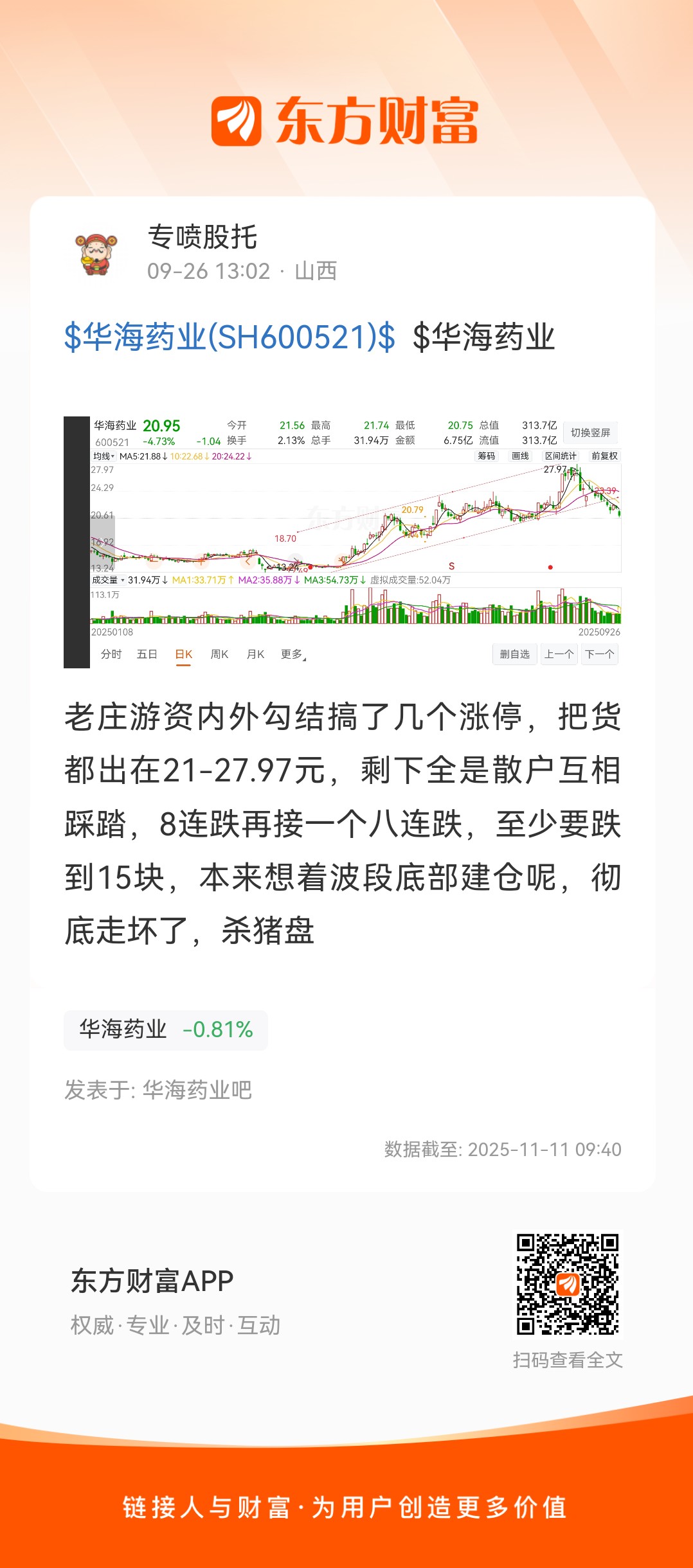 老庄游资内外勾结搞了几个涨停,把货都出在21-27.97元,剩下全是散户互相踩踏,8连跌再接一个八连跌,至少要跌到15块,本来想着波段底部建仓呢,彻底走坏了,杀猪盘