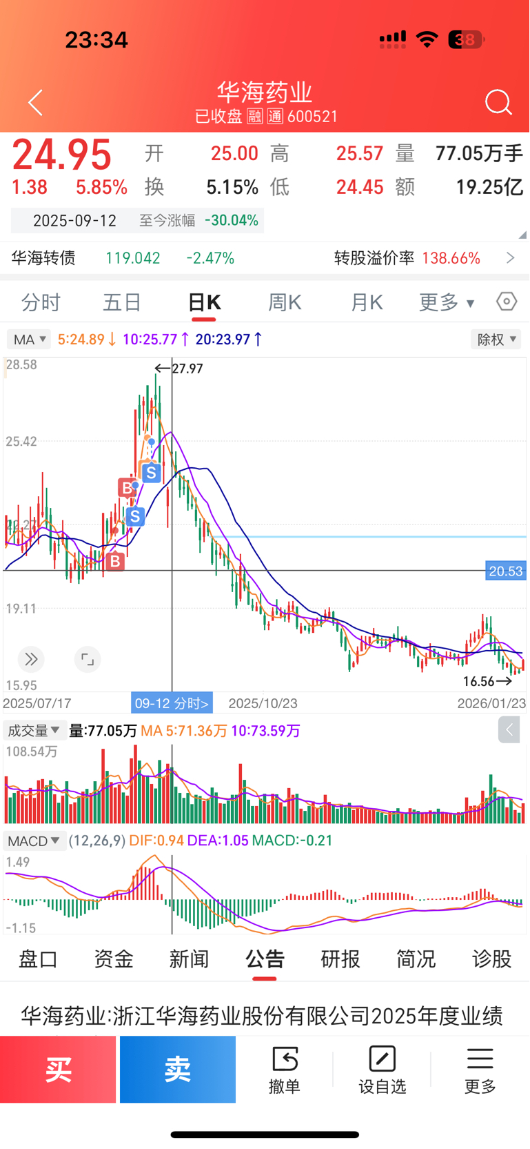 $华海药业(SH600521)$ 回头一看好险,还好最高的时候跑掉了