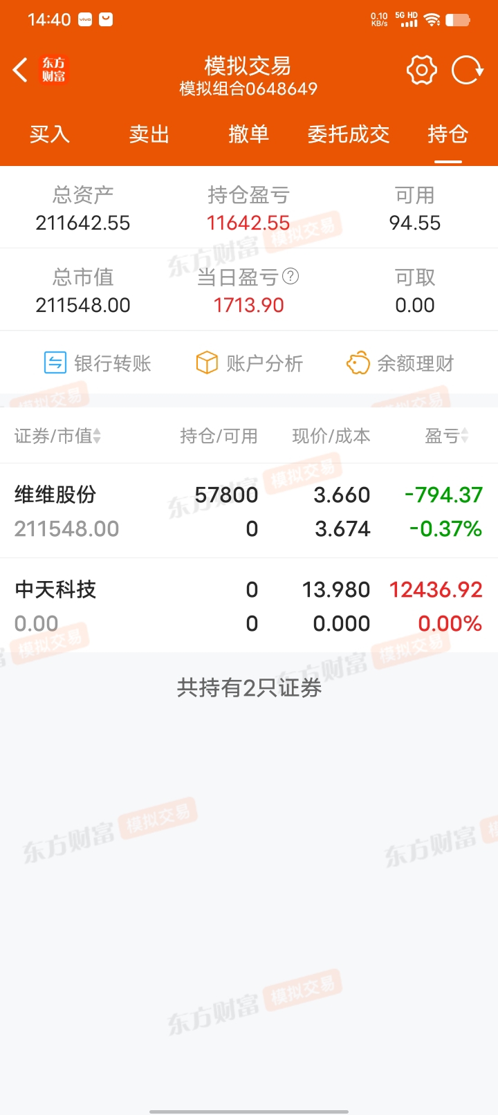 今天最高点卖出,小赚一万多,换了维维股份,继续磨吧