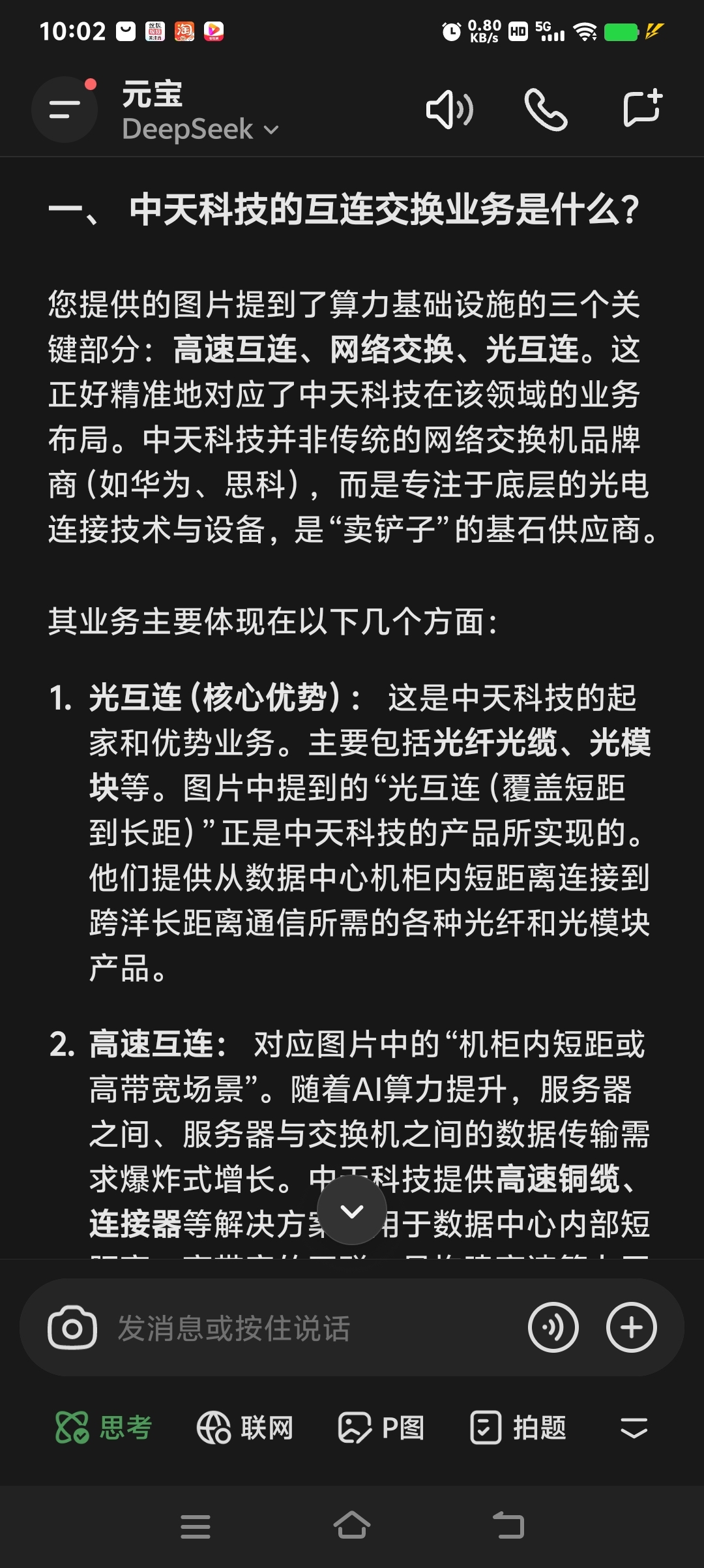 高速交换互联中的中天科技如日中天…!元宝、豆宝、通义中去搜中天科技的未来…!