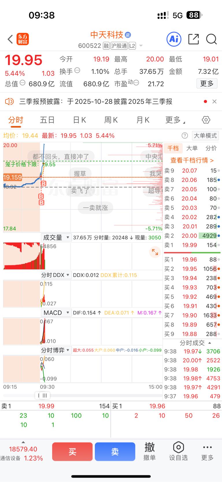 $中天科技(SH600522)$ 感谢主力给上车机会,还以为会低开没想到竞价最后几分钟还抢,谢谢主力的倒车,关注几天没忍住上车了。