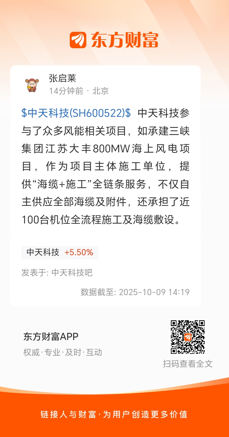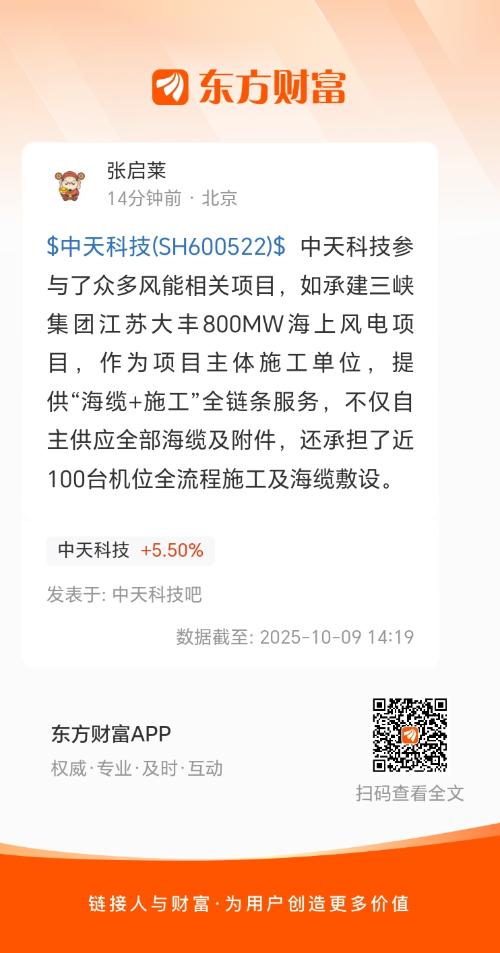$中天科技(SH600522)$ 中天科技参与了众多风能相关项目,如承建三峡集团江苏大丰800MW海上风电项目,作为项目主体施工单位,提供“海缆+施工”全链条服务,不仅自主供应全部海缆及附件,还承担了近100台机位全流程施工及海缆敷设。