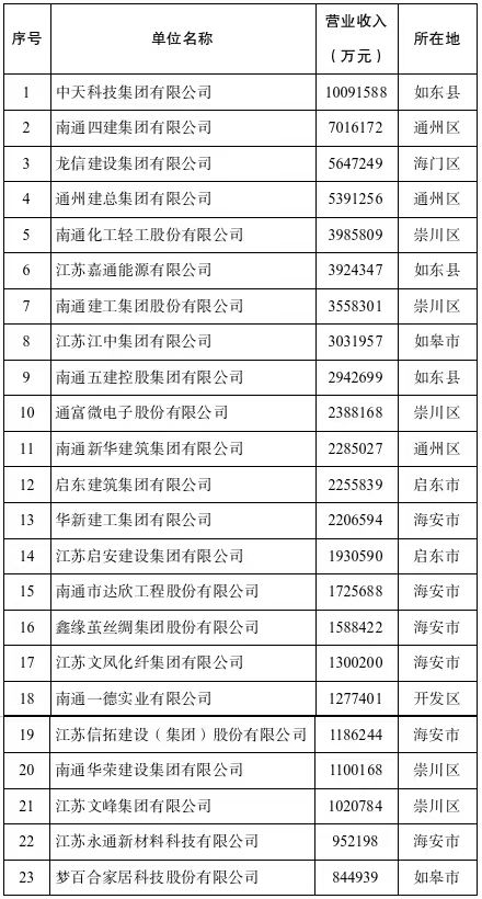 南通23家入围企业2024年度营业收入总额达到6765亿元,资产总额3129亿元,利润总额199亿元,出口总额231亿元。中天科技首次营业收入突破1000亿元,南通四建、龙信集团、通州建总3家营业收入超500亿元。
