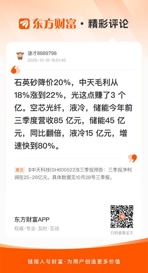 //@途才8889798 : 石英砂降价20%,中天毛利从18%涨到22%,光这点赚了3 个亿。空芯光纤,液冷,储能今年前三季度营收85 亿元,储能45 亿元,同比翻倍,液冷15 亿元,增速快到80%。