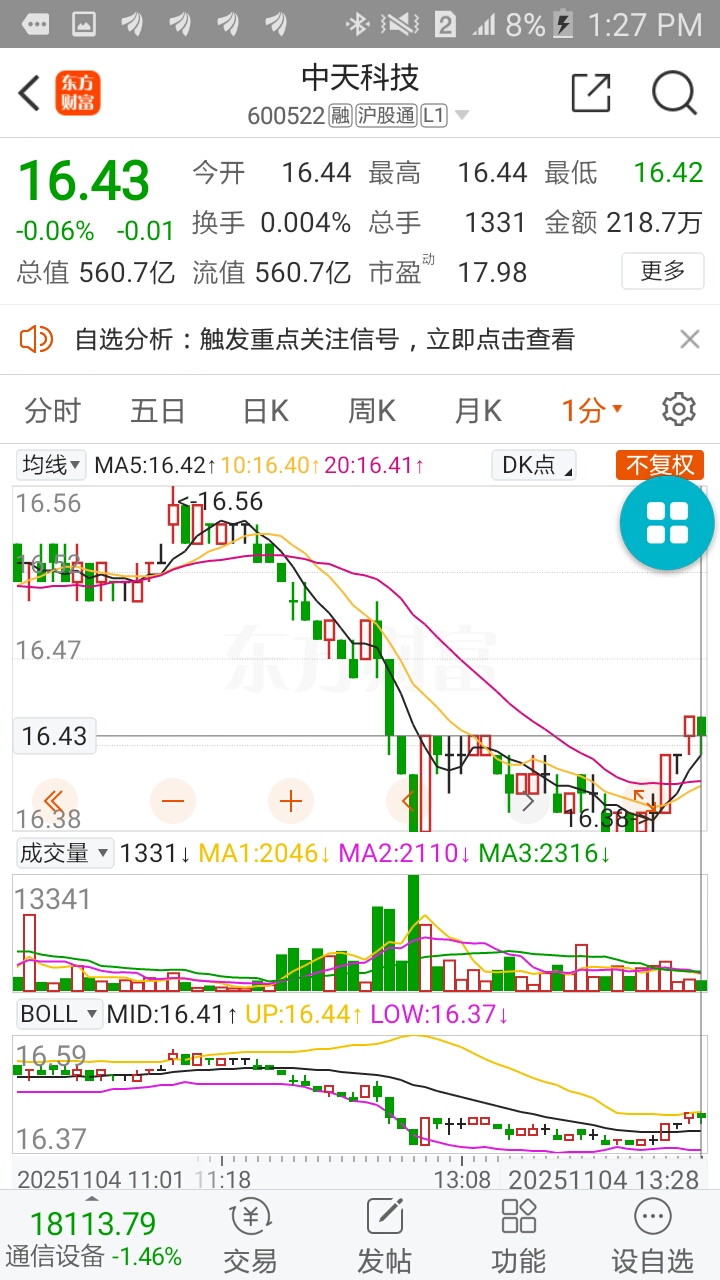 $中天科技(SH600522)$ 见高16.431后等回调至16.398再补仓买进