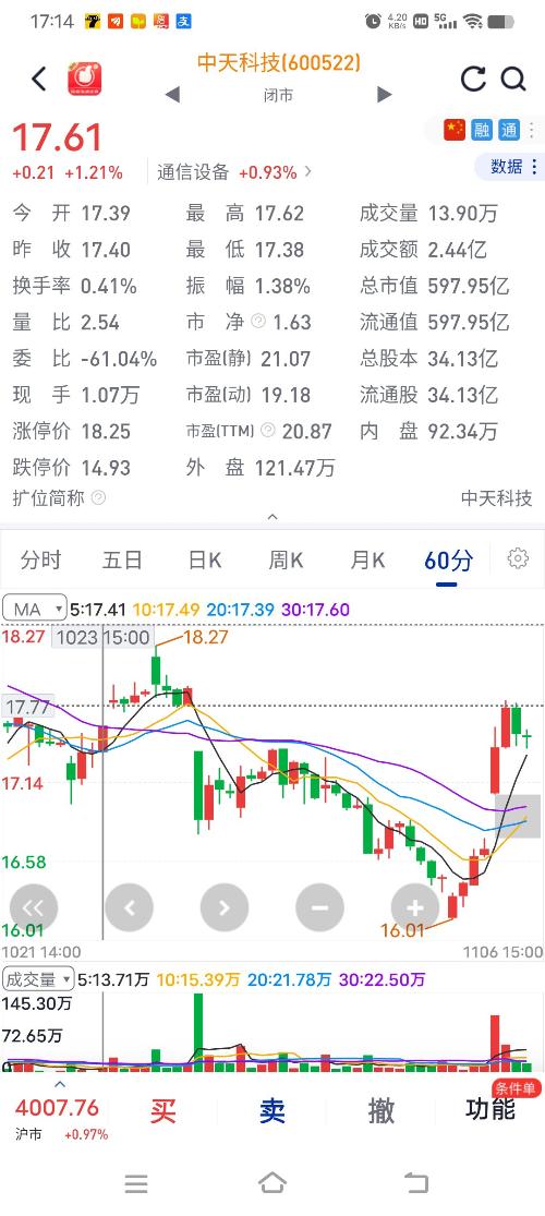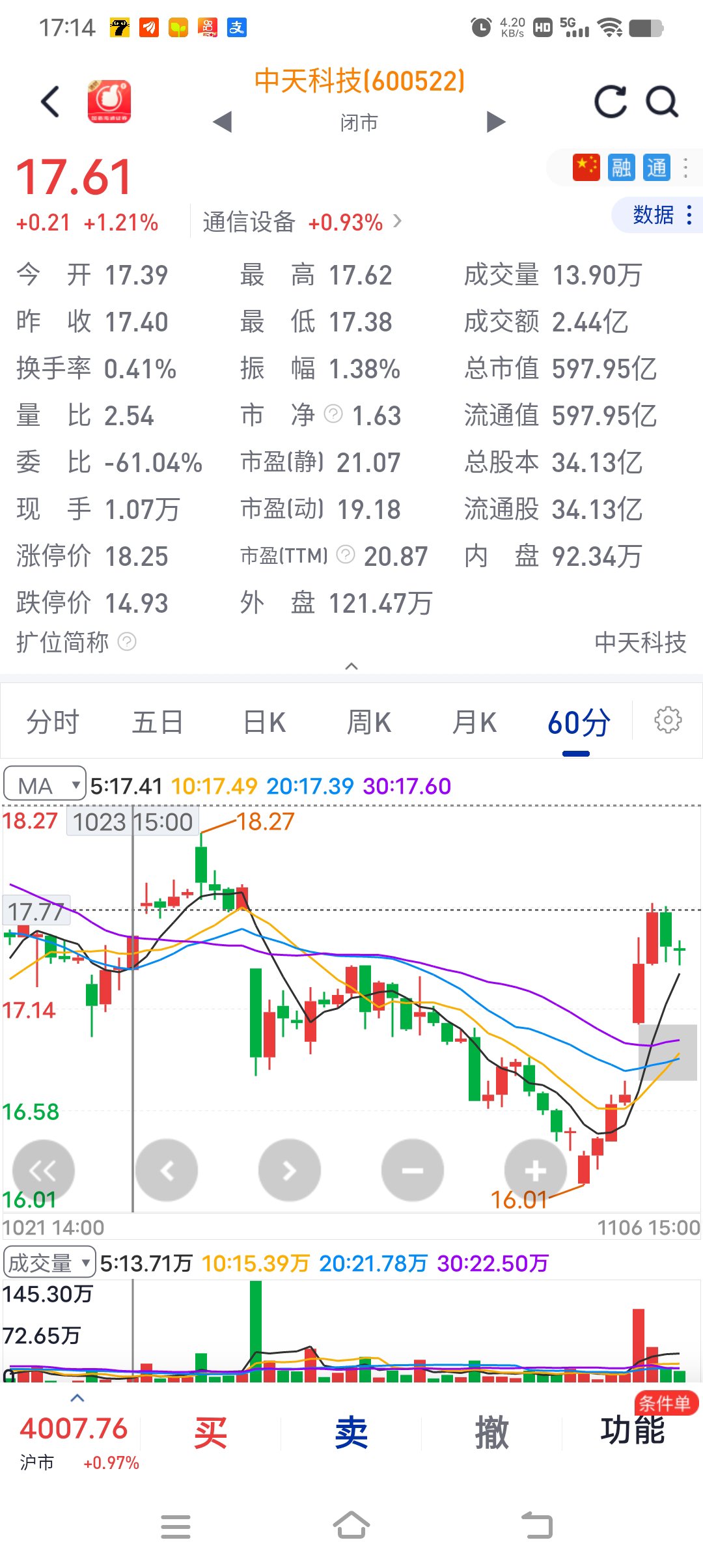 中天科技显神威,霸五举鼎惊世人。中兴通讯想冒头,一个瞪眼矬半身。大华股份要争功,奈何差距实在大。午后蓄势必扫板,封死涨停就庆功
