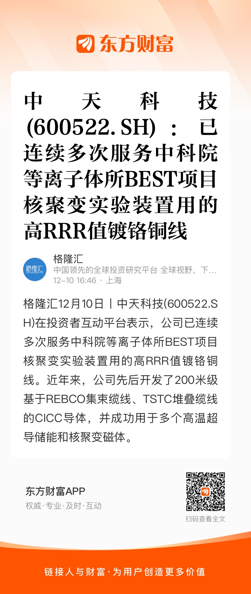 格隆汇12月10日丨中天科技(600522.SH)在投资者互动平台表示,公司已连续多次服务中科院等离子体所BEST项目核聚变实验装置用的高RRR值镀铬铜线。近年来,公司先后开发了200米级基于REBCO集束缆线、TSTC堆叠缆线的CICC导体,并成功用于多个高温超导储能和核聚变磁体。