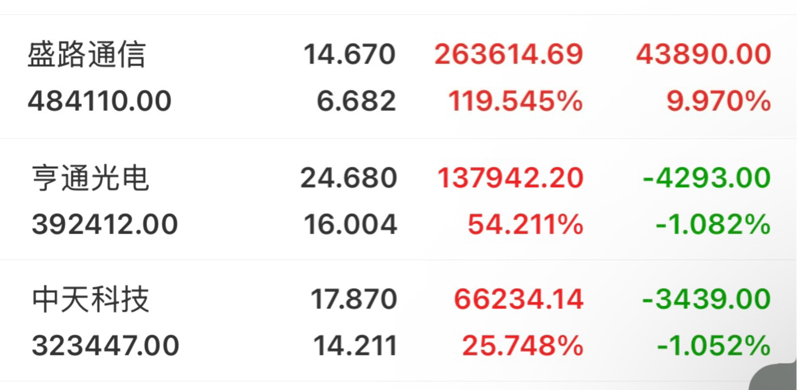 当初同时各买了二十多万的亨通光电,中天科技,盛路通信。一开始中天涨得最好,就想早