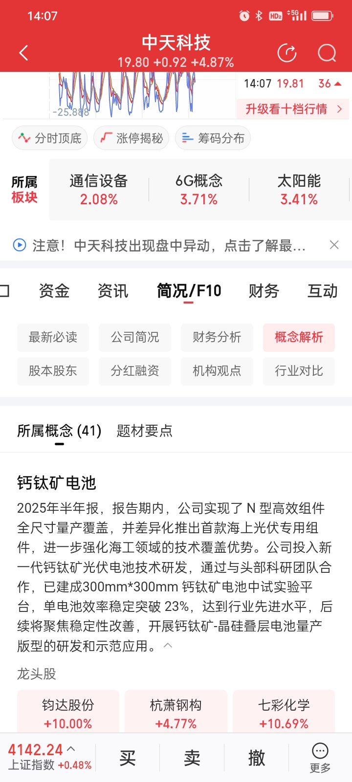 中天科技是一支最正宗的太空钙钛矿电池股!《东方财富》没有钙钛矿电池概念,《华泰证