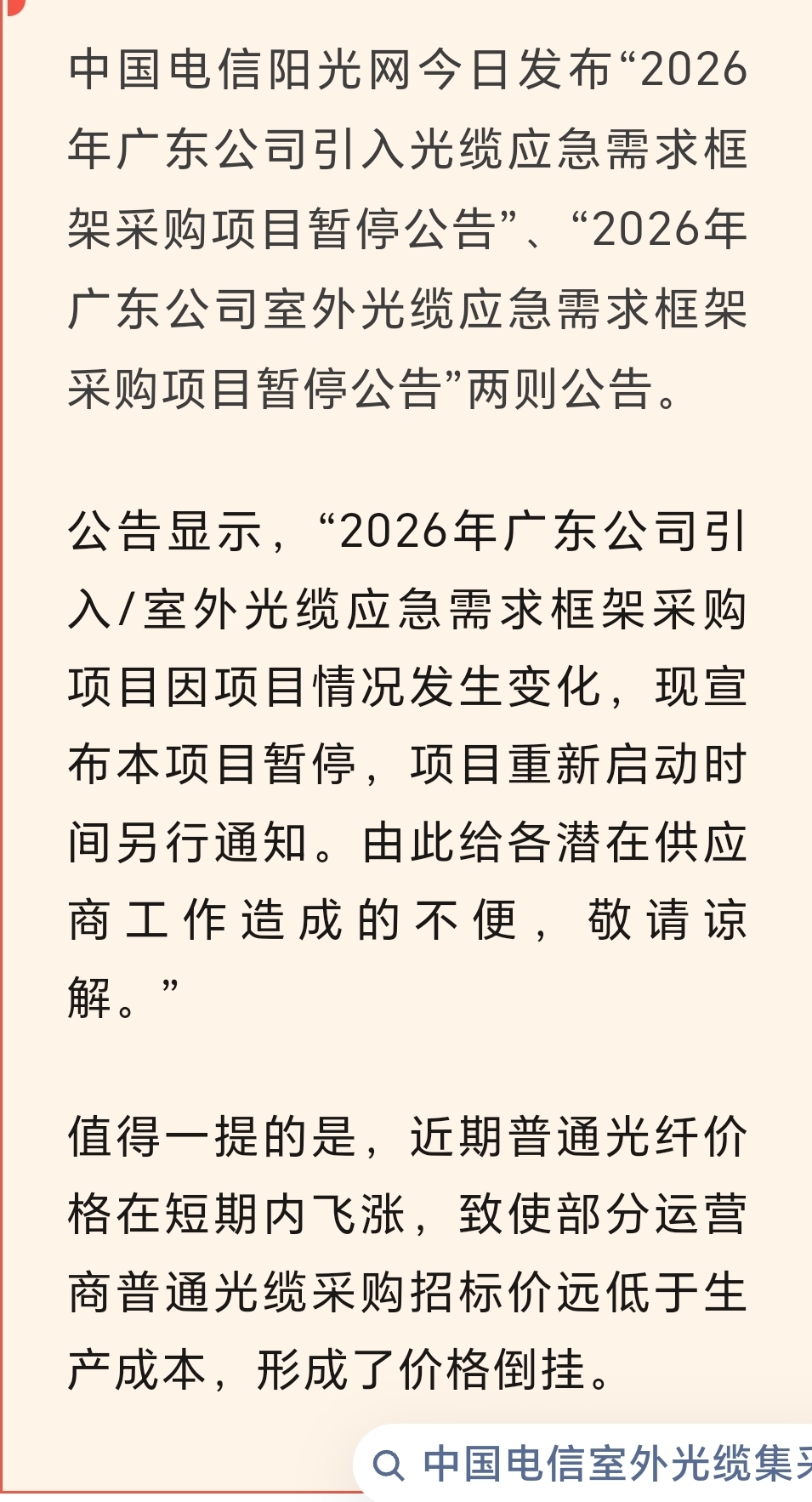 广东电信两项光缆采购项目暂停