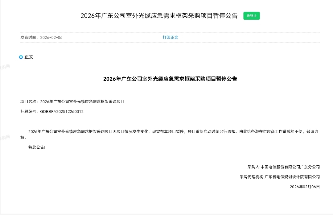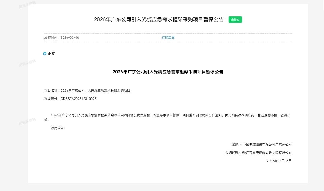 中国电信阳光网2月6日发布“2026年广东公司引入光缆应急需求框架采购项目暂停公告”、“2026年广东公司室外光缆应急需求框架采购项目暂停公告”两则公告。