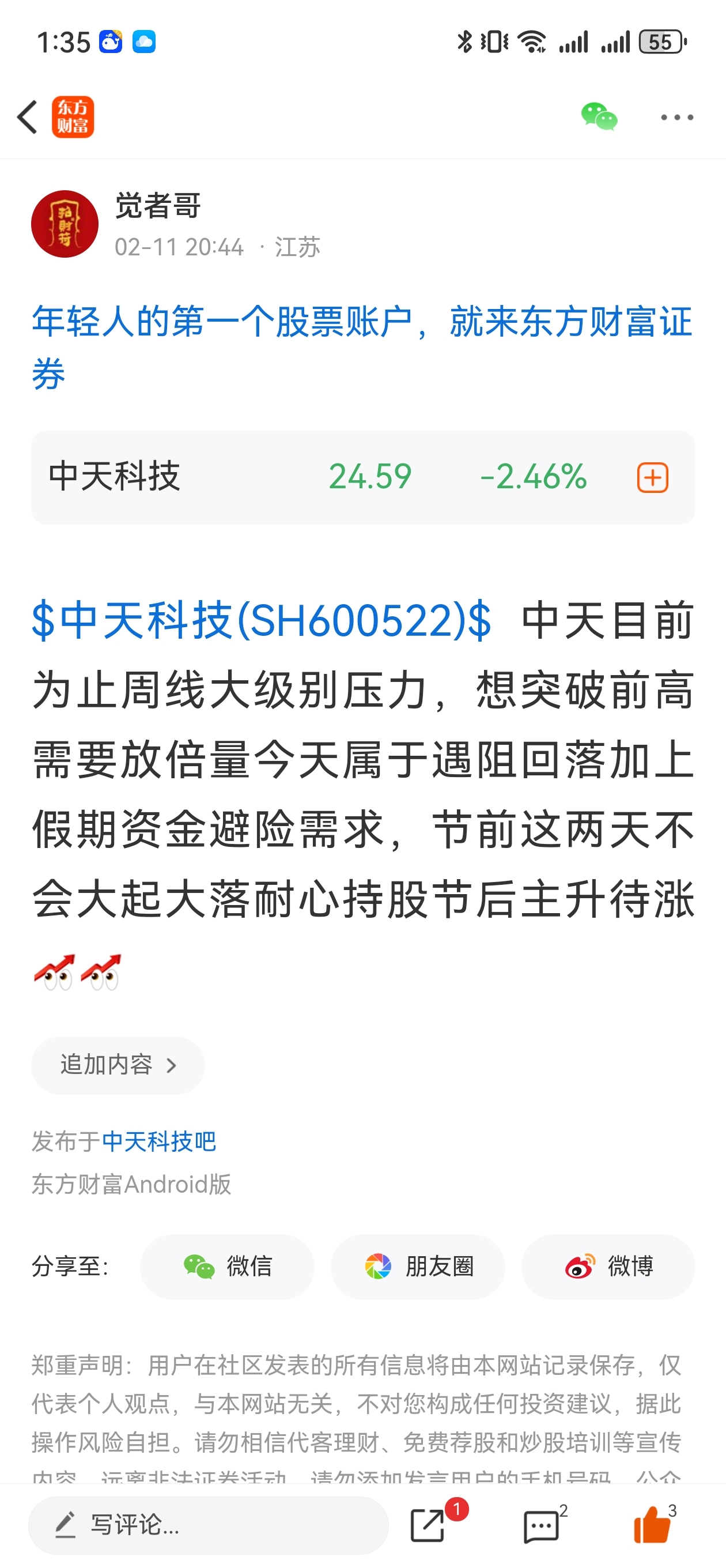 温馨提示: 1.根据《证券法》规定,禁止编造、传播虚假信息或者误导性信息,扰乱证券市场;2.用户在本社区发表的所有资料、言论等仅代表个人观点,与本网站立场无关,不对您构成任何投资建议。用户应基于自己的独立判断,自行决定证券投资并承担相应风险。《东方财富社区管理规定》