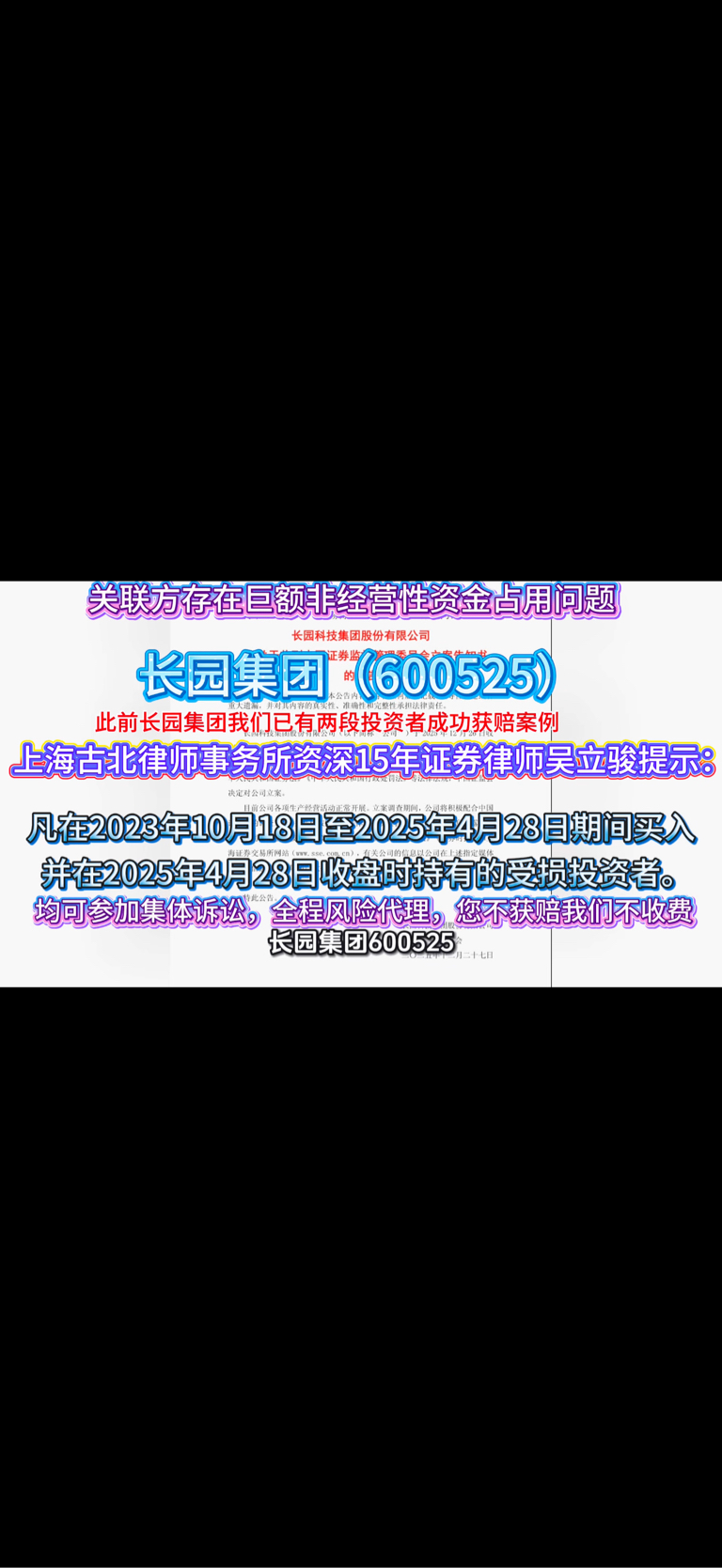 $ST长园(SH600525)$ 长园集团(600525)再次被证监会立案调查(针对2025年新披露事项及本次立案)违规事实:2025年4月公司年报被出具非标意见,揭露董事长控制的关联方存在巨额非经营性资金占用问题。上海古北律师事务所资深15年证券律师吴立骏提示:在2023年10月18日至2025年4月28日期间买入,并在2025年4月28日收盘时持有的受损投资者。可参加集体诉讼。