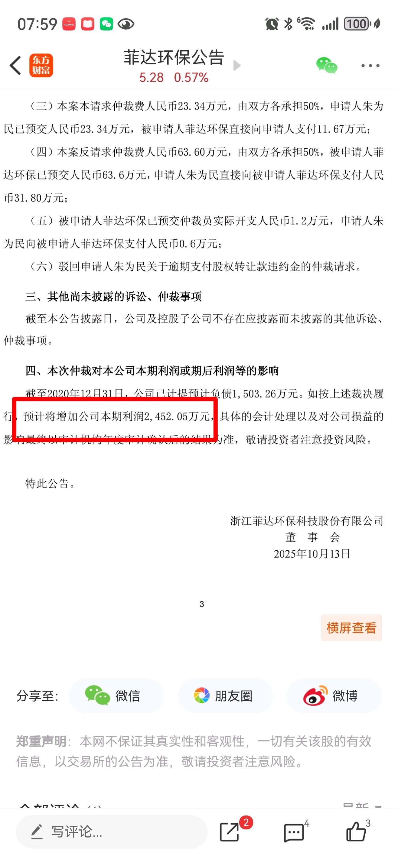 $菲达环保(SH600526)$ 仲裁案件落地了,利好,增加利润2千多万
