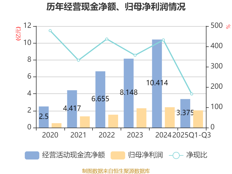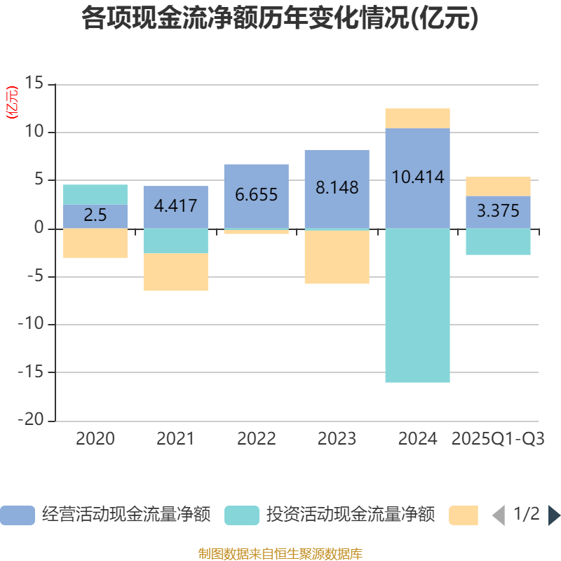 2025年前三季度,公司经营活动现金流净额为3.38亿元,同比下降19.61%;筹资活动现金流净额2亿元,同比增加4.81亿元;投资活动现金流净额-2.76亿元,上年同期为-5639.6万元。