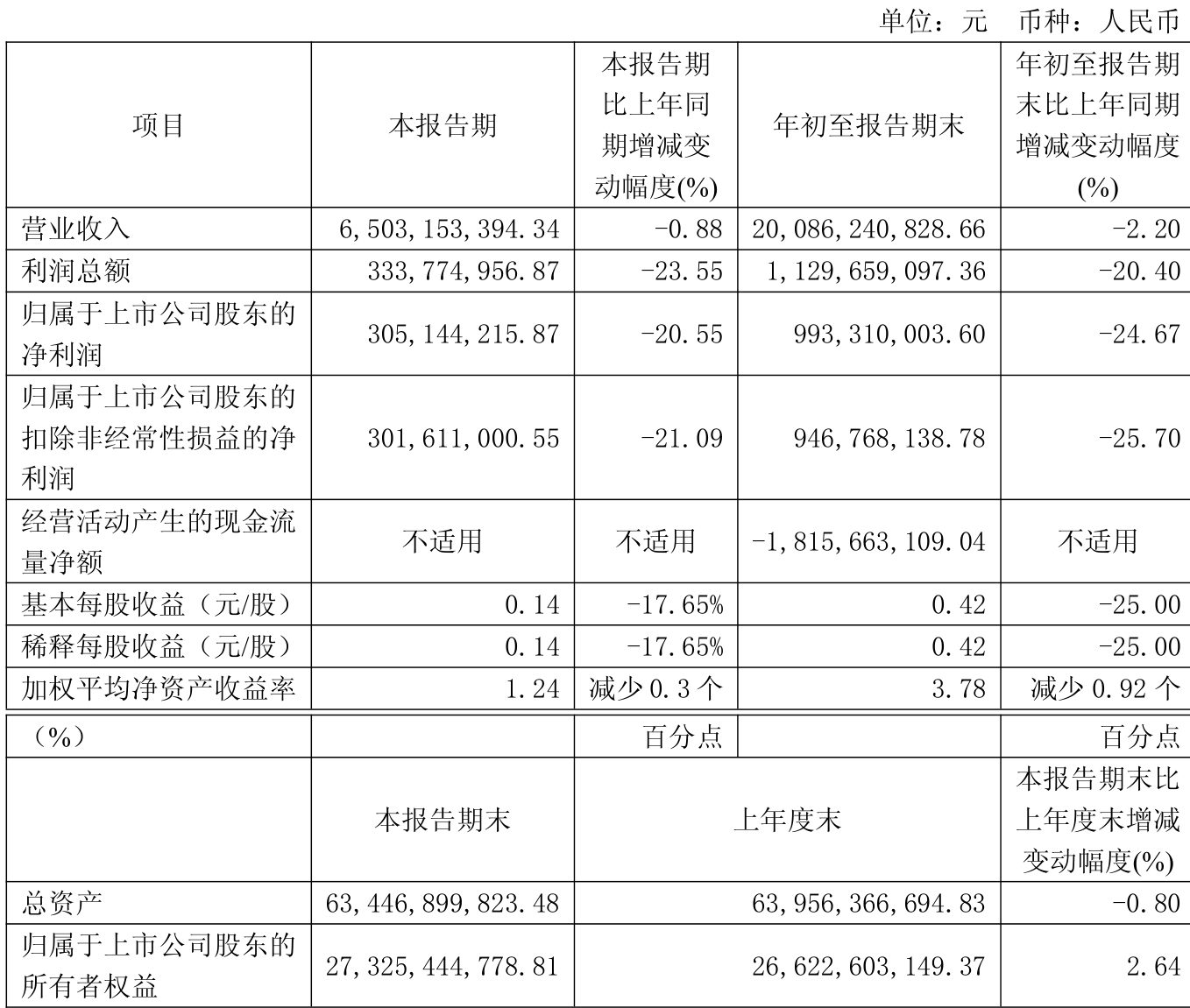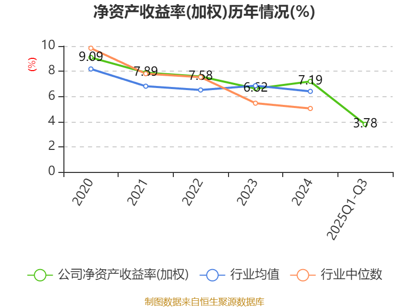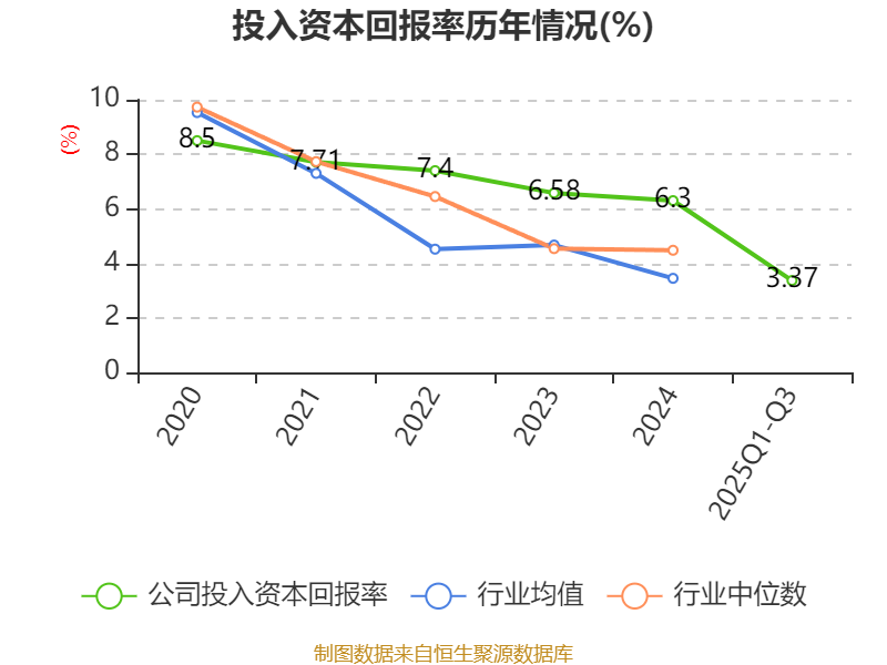 盈利能力方面, 2025年前三季度公司加权平均净资产收益率为3.78%,同比下降0.92个百分点。公司2025年前三季度投入资本回报率为3.37%,较上年同期下降1.35个百分点。