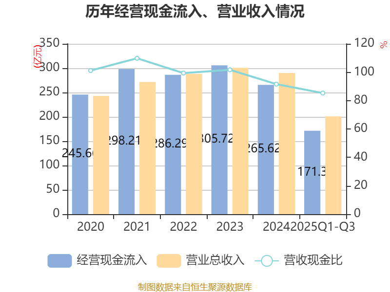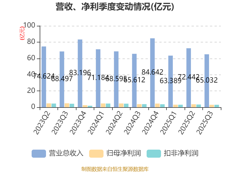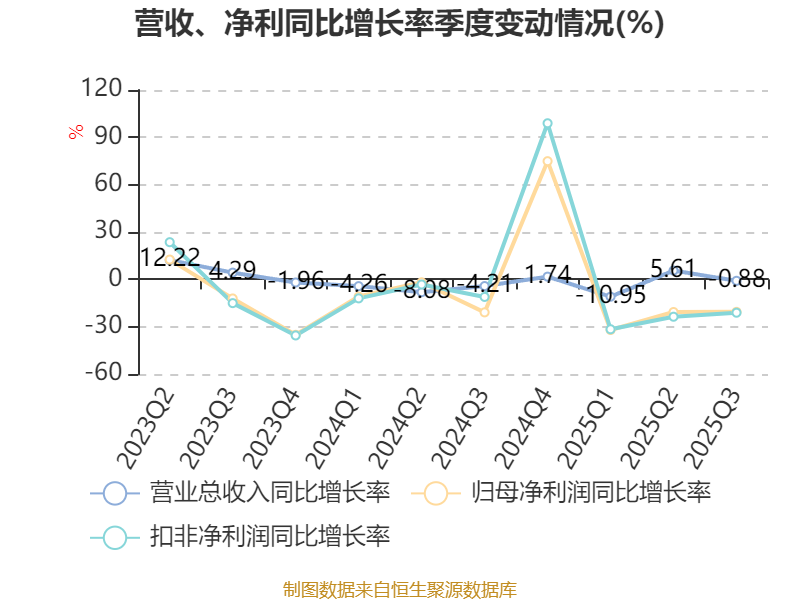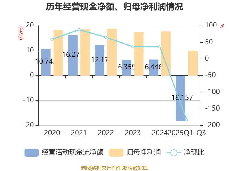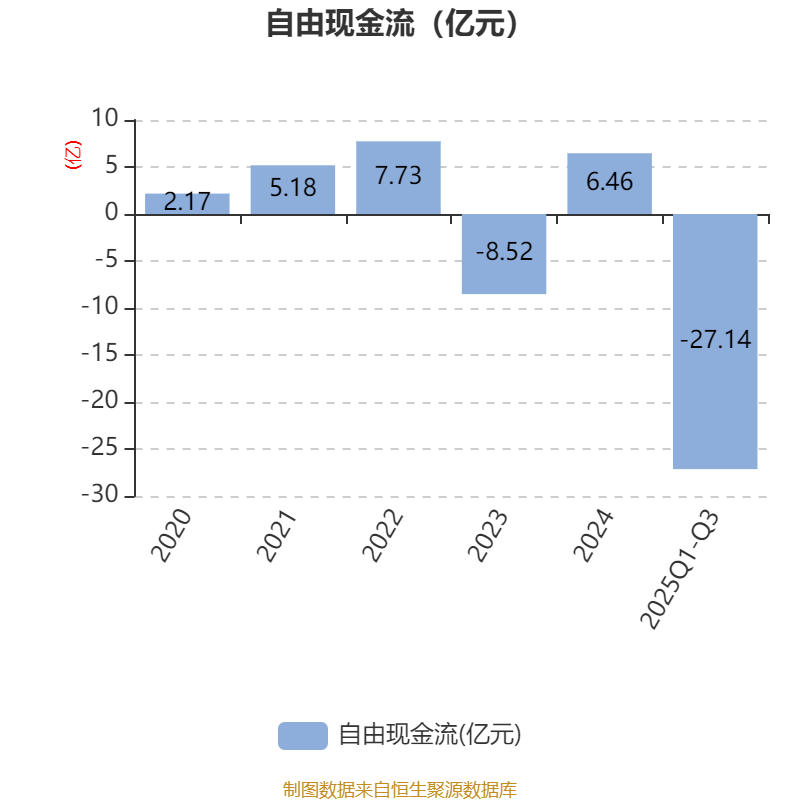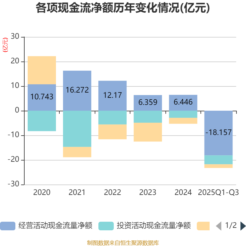 2025年前三季度,公司经营活动现金流净额为-18.16亿元,同比减少2.69亿元;筹资活动现金流净额-1.5亿元,同比增加9376.23万元;投资活动现金流净额-3.62亿元,上年同期为-8562.56万元。