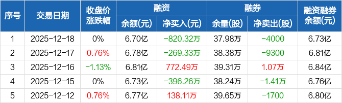 中铁工业:融资净偿还820.32万元,融资余额6.7亿元(12-18)