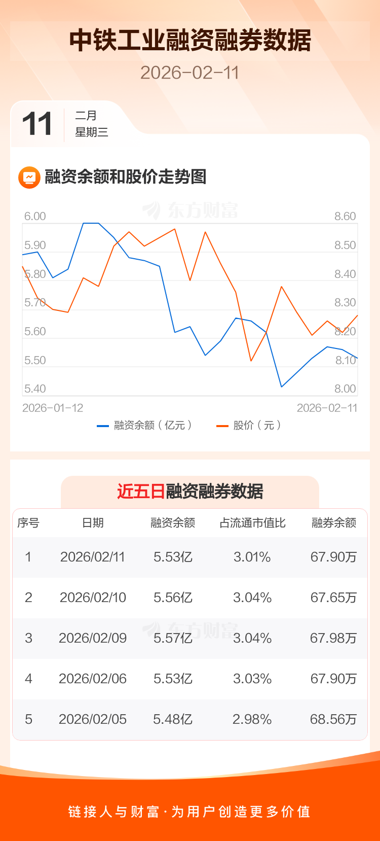 交易所最新数据显示,中铁工业于2026年2月11日获融资买入603.97万元,融资偿还907.96万元,当日融资净偿还303.98万元。目前,该股融资余额5.53亿,占流通市值比例为3.01%。