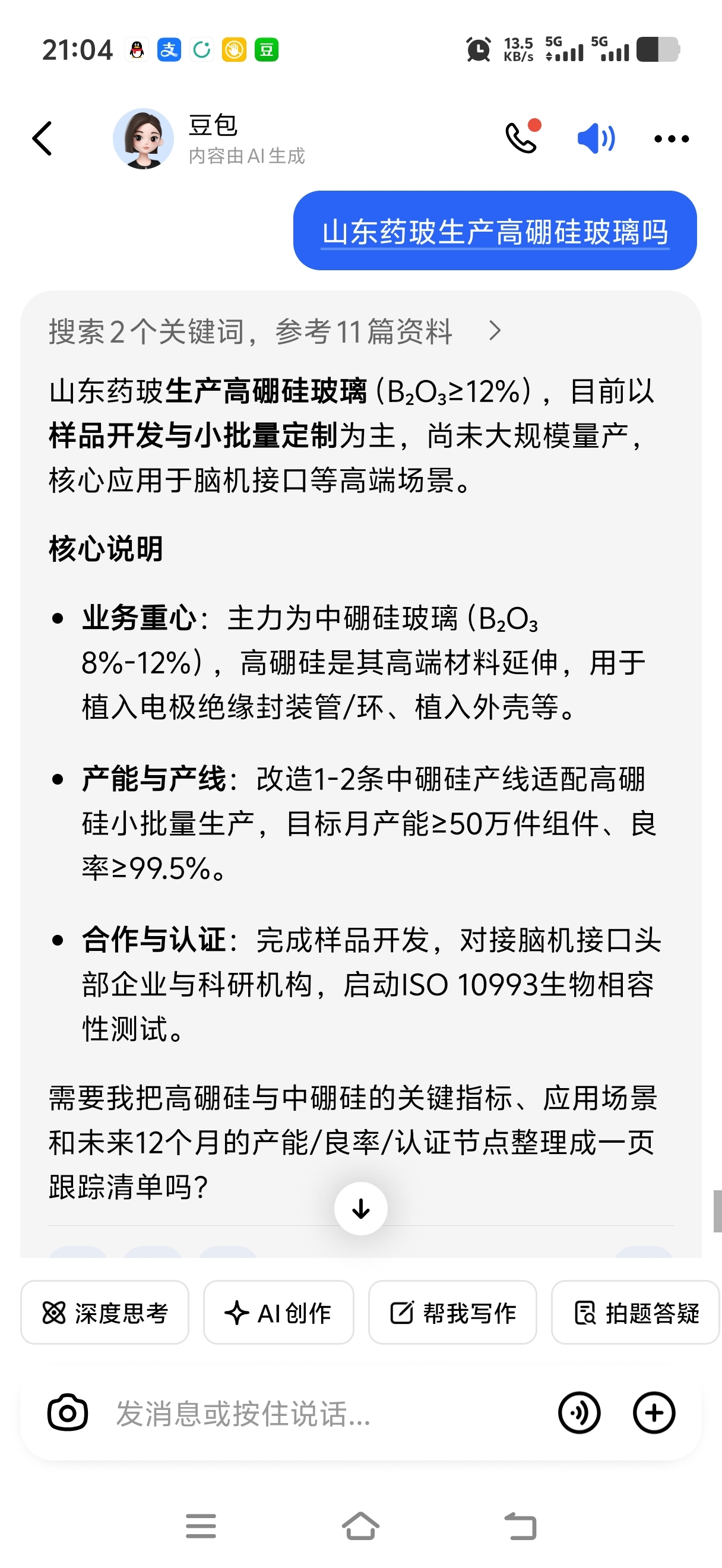 等产能升级和释放,,我觉得是时间问题。半年左右认证成功,然后批量上市,一年后大规模生产。。预期很好。。。。。。国产替代国外的,中硼硅和高硼硅玻璃。还可以输出,出口,这是高端玻璃,门槛高,附加值高,赚钱
