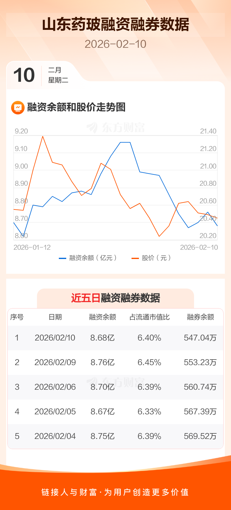 交易所最新数据显示,山东药玻于2026年2月10日获融资买入604.43万元,融资偿还1414.27万元,当日融资净偿还809.84万元。目前,该股融资余额8.68亿,占流通市值比例为6.40%。