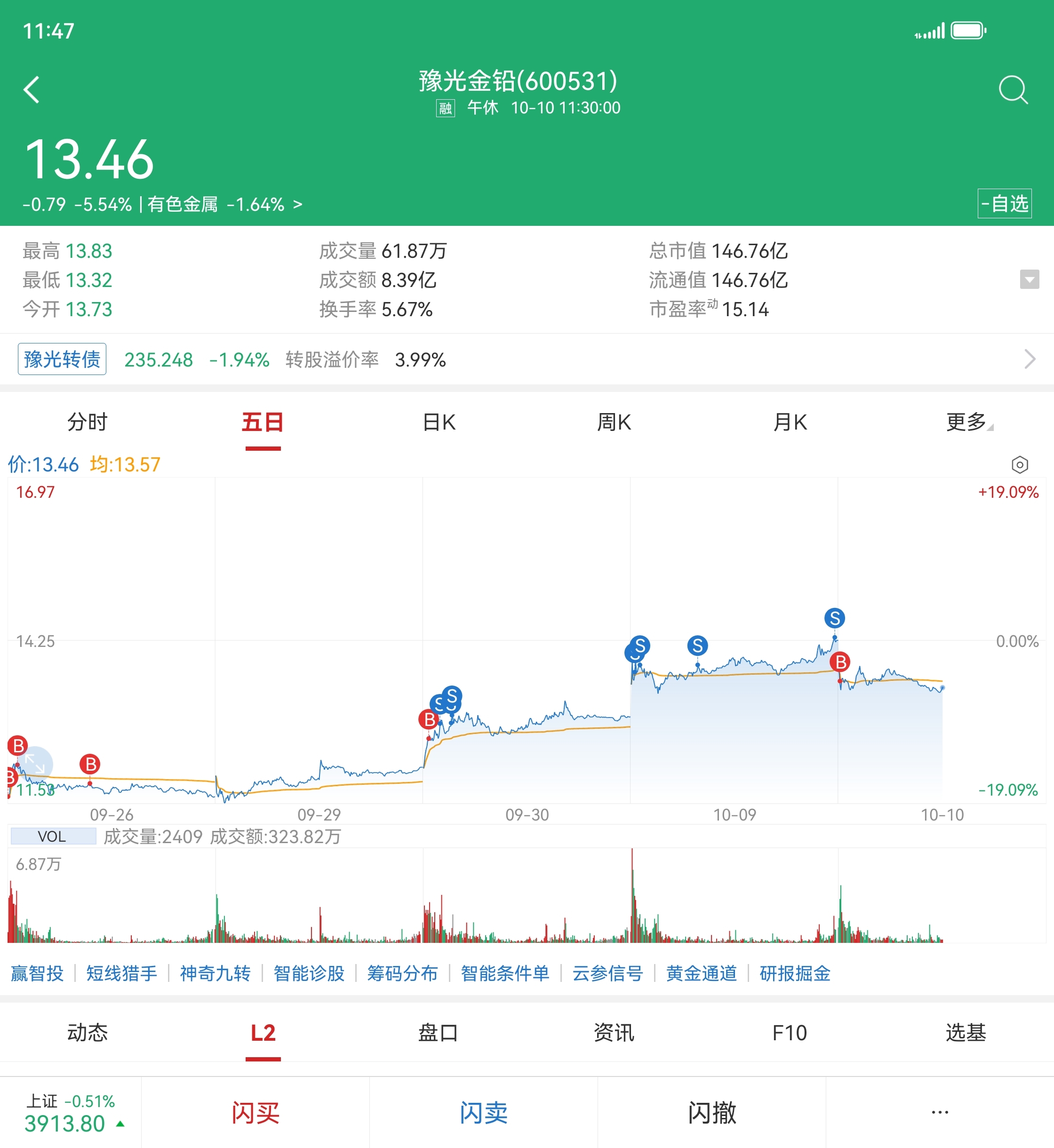 昨天尾盘14.26元减仓的1万股,早上13.42元回补进来了。