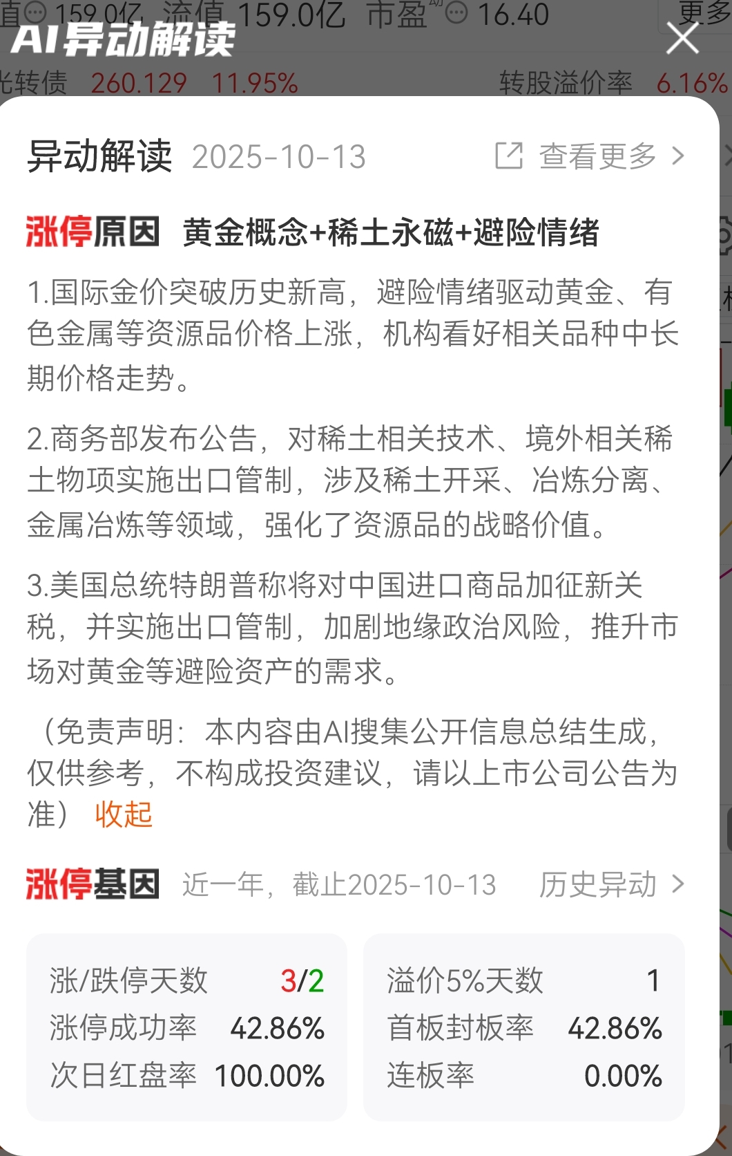 10月13日豫光金铅Ai涨停原因分析:黄金概念+稀土永磁+避险情绪。