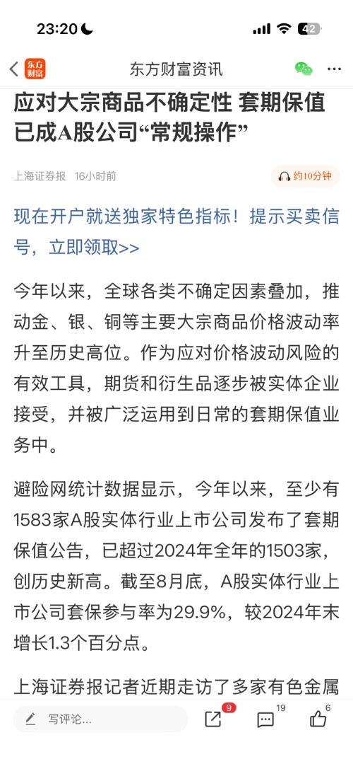 今年以来,全球各类不确定因素叠加,推动金、银、铜等主要大宗商品价格波动率升至历史高位。作为应对价格波动风险的有效工具,期货和衍生品逐步被实体企业接受,并被广泛运用到日常的套期保值业务中。避险网统计数据显示,今年以来,至少有1583家A股实体行业上市公司发布了套期保值公告,已超过2024年全年的1503家,创历史新高。截至8月底,A股实体行业上市公司套保参与率为29.9%,较2024年末增长1.3个百分点。 //@筼筜风轻 :逼的是裸空的单子,他是国企,最多用库存60%锁定利润,产品连续下跌才有可能出现库存跌幅超过套保价格的价差亏损,而产品单边上涨的牛市里,部分库存的套保空单赔了可以现货交割,也可以靠卖库给赚回来(还能多赚点),最多只是少赚点而已。
