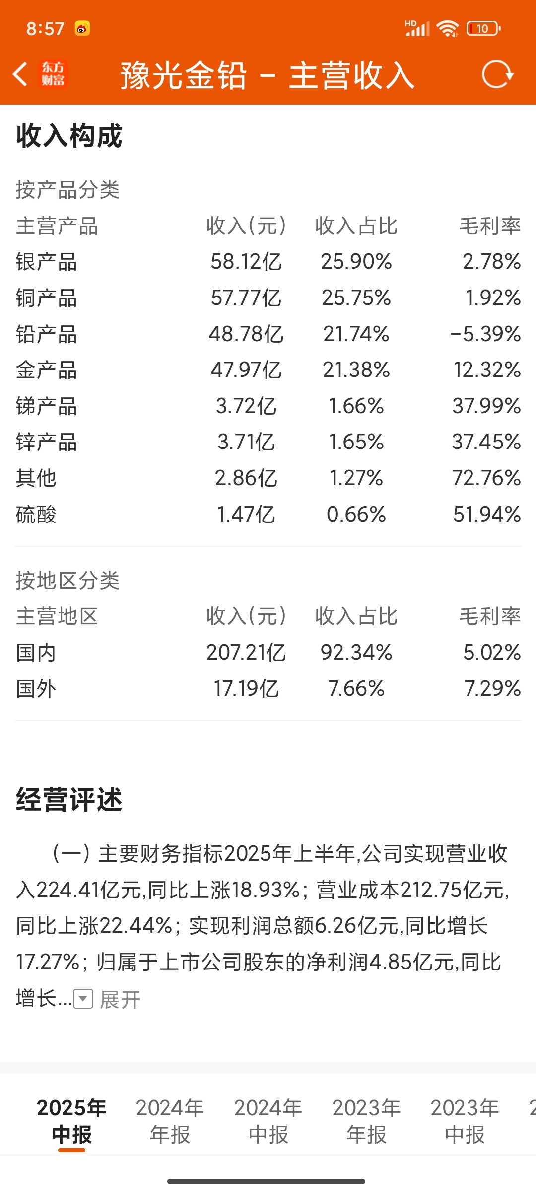$豫光金铅(SH600531)$ 全国最大白银生产企业之一,2024年产量1384吨。现货白银上半年7.5元收盘,今现货价13.03元。看半年财报