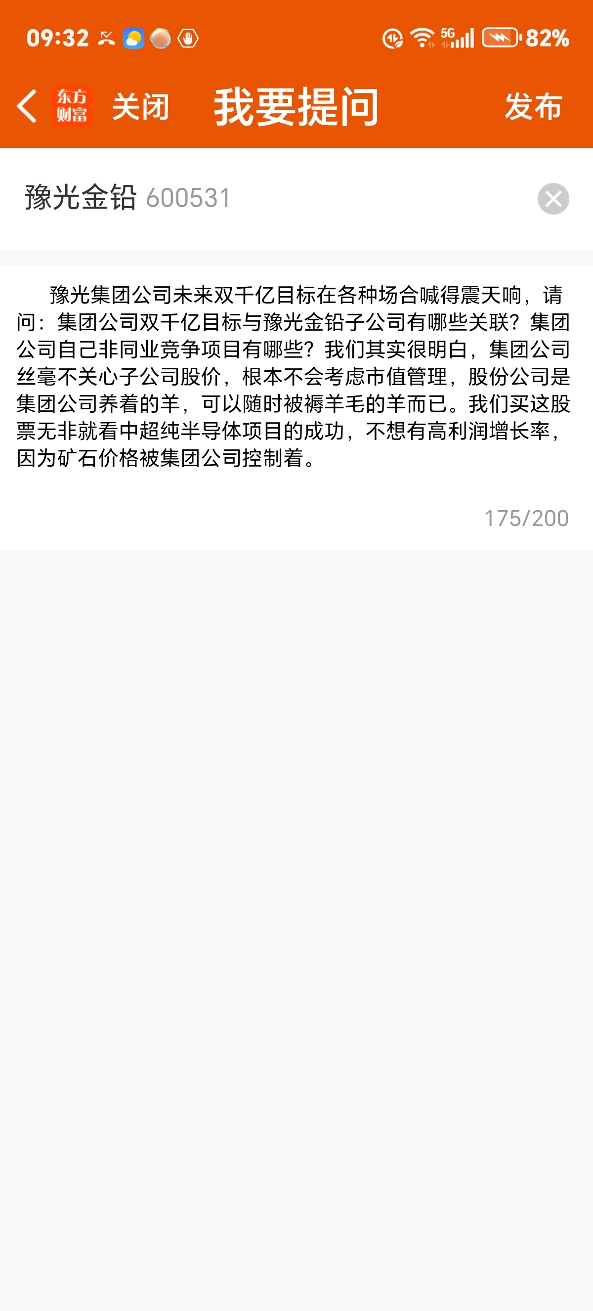 $豫光金铅(SH600531)$ 刚才发问董秘,集团公司双千亿目标与子公司有何相关?子公司是豫光集团养着的羊,随时可以褥羊毛。母公司出来不会增持子公司股票,哪怕跌地板上。前天孚日股份二天回调,二股东出手增持130万股,昨天秒板。