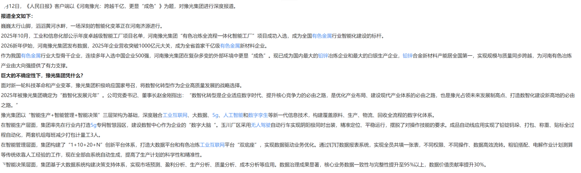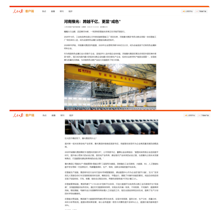 1月12日,《人民日报》客户端以《河南豫光:跨越千亿,更显“成色”》为题,对豫光集团进行深度报道。